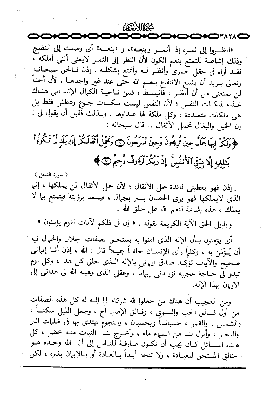 {انظروا إلى ثَمَرِهِ إِذَآ أَثْمَرَ وَيَنْعِهِ} ، و «ينعه» أي وصلت إلى النضج وذلك إشاعة للتمتع بنعم الكون لأن النظر إلى الثمر لا يعني أنني أملكه، فقد أراه في حقل جاري وأنظر له وأتمتع بشكله. إذن فالحق سبحانه وتعالى يريد أن يشيع الانتفاع بنعم الله حتى عند غير واجدها، لأن أحداً لن يمنعني من أن أنظر، فأنبسط، فمن ناحية الكمال الإنساني هناك غذاء لملكات النفس؛ لأن النفس ليست ملكات جوع وعطش فقط بل هي ملكات متعددة، وكل ملكة لها غذاؤها. ولذلك فقبل أن يقول لي: إن الخيل والبغال تحمل الأثقال. . قال سبحانه: {وَلَكُمْ فِيهَا جَمَالٌ حِينَ تُرِيحُونَ وَحِينَ تَسْرَحُونَ وَتَحْمِلُ أَثْقَالَكُمْ إلى بَلَدٍ لَّمْ تَكُونُواْ بَالِغِيهِ إِلاَّ بِشِقِّ الأنفس إِنَّ رَبَّكُمْ لَرَؤُوفٌ رَّحِيمٌ} [النحل: 6 - 7] .