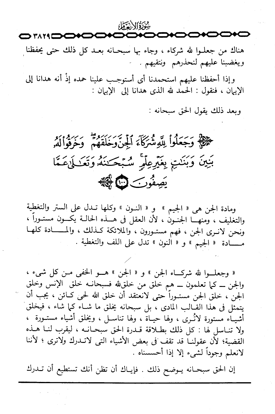 {وَجَعَلُواْ للَّهِ شُرَكَآءَ الجن} و «الجن» هو الخفي من كل شيء، والجن - كما تعلمون - هم خلق من خلق الله فسبحانه خلق الإنس وخلق الجن، خلق الجن مستوراً حتى لا نعتقد أن خلق الله لحي كائن، يجب أن يتمثل في هذا القالب المادي، بل سبحانه يخلق ما شاء وكما شاء، فيخلق أشياء مستورة لا تُرى، ولها حياة، ولها تناسل، ويخلق أشياء مستورة، ولا تناسل لها: كل ذلك بطلاقة قدرة الحق سبحانه، ليقرب لنا هذه القضية؛ لأن عقولنا قد تقف في بعض الأشياء التي لا تدرك ولا ترى؛ لأننا لا نعلم وجوداً لشيء إلا إذا أحسسناه.