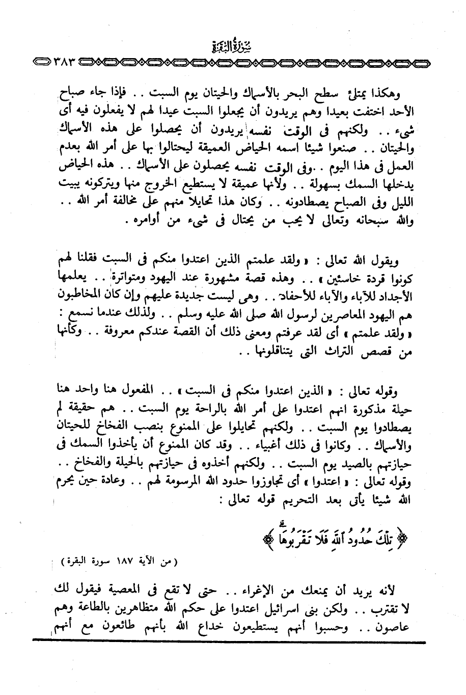 وهكذا يمتلئ سطح البحر بالأسماك والحيتان يوم السبت. . فإذا جاء صباح الأحد اختفت بعيدا وهم يريدون أن يجعلوا السبت عيدا لهم لا يفعلون فيه أي شيء. . ولكنهم في الوقت نفسه يريدون أن يحصلوا على هذه الأسماك والحيتان. . صنعوا شيئا اسمه الحياض العميقة ليحتالوا بها على أمر الله بعدم العمل في هذا اليوم. . وفي الوقت نفسه يحصلون على الأسماك. . هذه الحياض يدخلها السمك بسهولة. . ولأنها عميقة لا يستطيع الخروج منها ويتركونه يبيت الليل وفي الصباح يصطادونه. . وكان هذا تحايلا منهم على مخالفة أمر الله. . والله سبحانه وتعالى لا يحب من يحتال في شيء من أوامره.