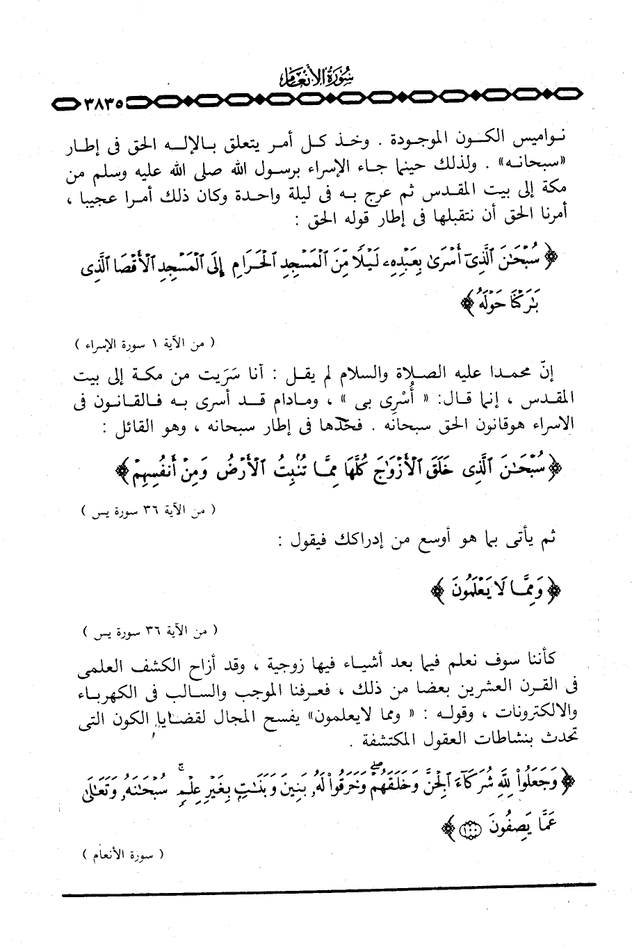 إن محمداً عَلَيْهِ الصَّلَاة وَالسَّلَام ُ لم يقل: أنا سَرَيت من مكة إلى بيت المقدس، إنما قال: أُسْرِي بي «، وما دام قد أسري به فالقانون في الإسراء هو قانون الحق سبحانه. فخذها في إطار سبحانه، وهو القائل: {سُبْحَانَ الذي خَلَق الأزواج كُلَّهَا مِمَّا تُنبِتُ الأرض وَمِنْ أَنفُسِهِمْ} [يس: 36] .
