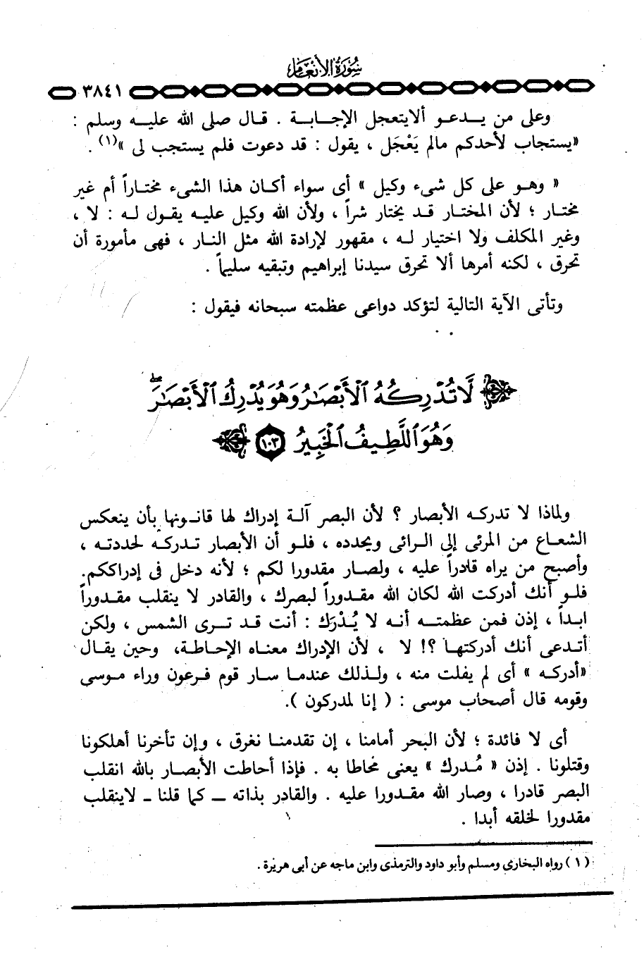 ولماذا لا تدركه الأبصار؟ لأن البصر آلة إدراك لها قانونها بأن ينعكس الشعاع من المرئي إلى الرائي ويحدده، فلو أن الأبصار تدركه لحددته، وأصبح من يراه قادراً عليه، ولصار مقدوراً لكم؛ لأنه دخل في إدارككم. فلو أنك أدركت الله لكان الله مقدوراً لبصرك، والقادر لا ينقلب مقدوراً ابداً، إذن فمن عظمته انه لا يُدْرَك: أنت قد ترى الشمس، ولكن أتدعي أنك أدركتها؟ {لا، لأن الإدراك معناه الإحاطة، وحين يقال «أدركه» أي لم يفلت منه، ولذلك عندما سار قوم فرعون وراء موسى وقومه قال أصحاب موسى: {اإِنَّا لَمُدْرَكُونَ} .
