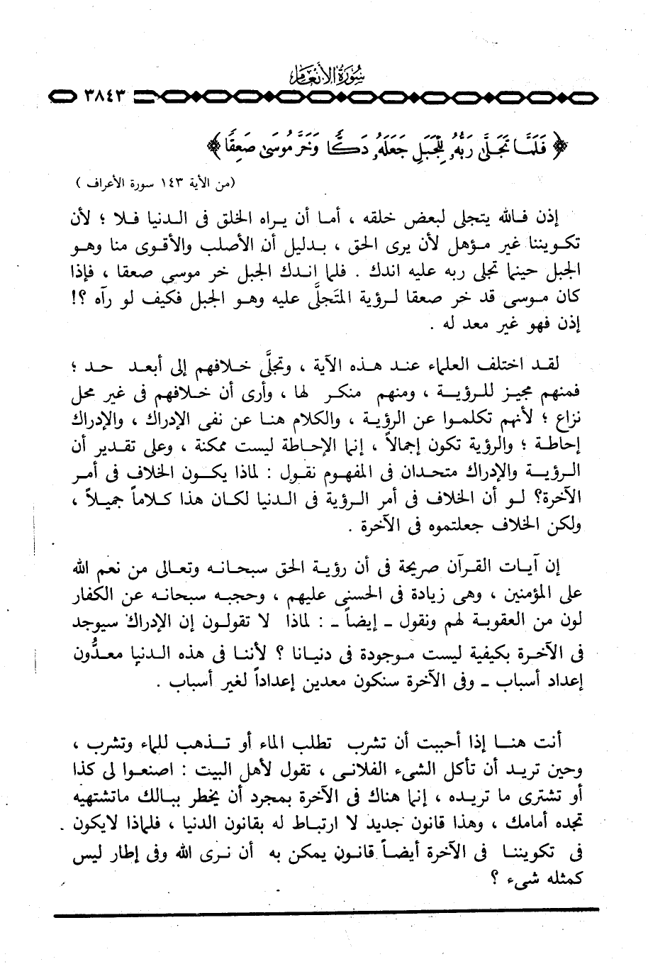 إن آيات القرآن صريحة في أن رؤية الحق سبحانه وتعالى من نعم الله على المؤمنين، وهي زيادة في الحسنى عليهم، وحجبه سبحانه عن الكفار لون من العقوبة لهم ونقول - أيضاً -: لماذا لا تقولون إن الإدراك سيوجد في الآخرة بكيفية ليست موجودة في دنيانا؟ لأننا في هذه الدنيا معدُّون إعداد أسباب - وفي الآخرة سنكون معدين إعداداً لغير أسباب.