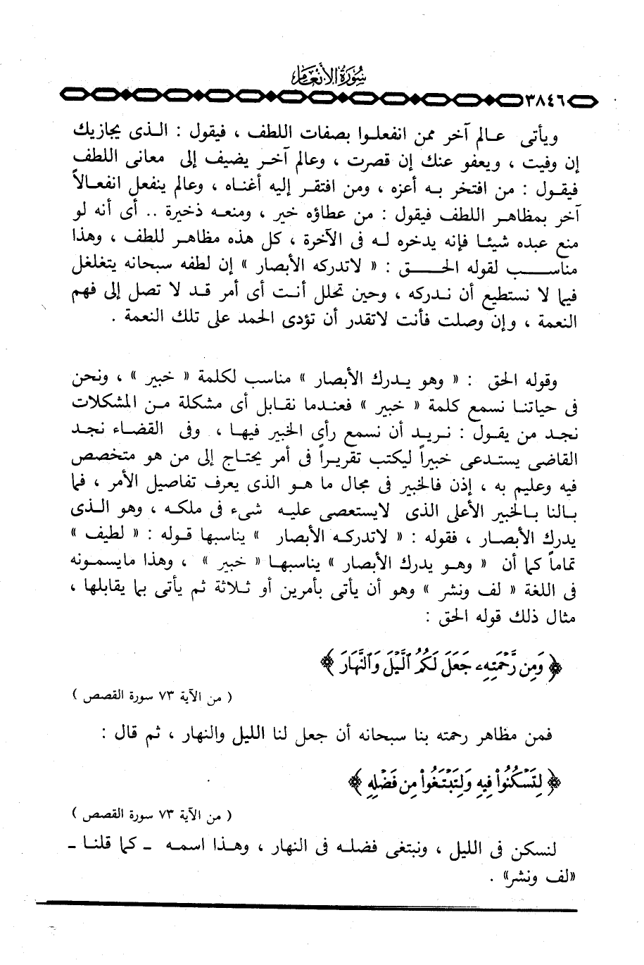 وقوله الحق: {وَهُوَ يُدْرِكُ الأبصار} مناسب لكلمة «خبير» ، ونحن في حياتنا نسمع كلمة «خبير» فعندما نقابل أي مشكلة من المشكلات نجد من يقول: نريد أن نسمع رأي الخبير فيها، وفي القضاء نجد القاضي يستدعي خبيراً ليكتب تقريراً في أمر يحتاج إلى من هو متخصص فيه وعليم به، إذن فالخبير في مجال ما هو الذي يعرف تفاصيل الأمر، فما بالنا بالخبير الأعلى الذي لا يستعصي عليه شيء في ملكه، وهو الذي يدرك الأبصار، فقوله: {لاَّ تُدْرِكُهُ الأبصار} يناسبها «خبير» ، وهذا ما يسمونه في اللغة «لف ونشر» وهو ان يأتي بأمرين أو ثلاثة ثم يأتي بما يقابلها، مثال ذلك قوله الحق: {وَمِن رَّحْمَتِهِ جَعَلَ لَكُمُ الليل والنهار} [القصص: 73] .