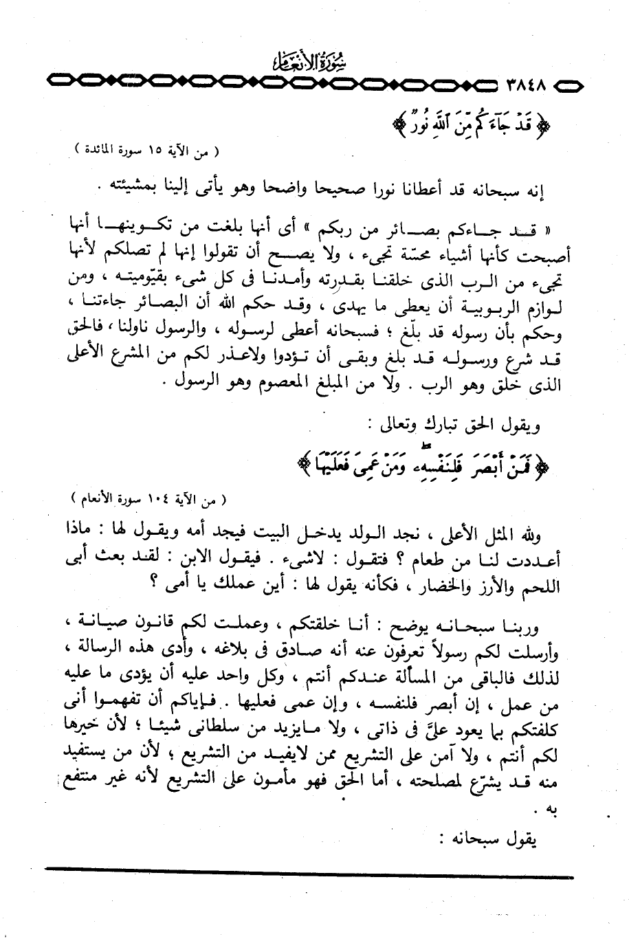 وربنا سبحانه يوضح: أنا خلقتكم، وعملت لكم قانون صيانة، وأرسلت لكم رسولاً ولا تعرفون عنه أنه صادق في بلاغه، وأدى هذه الرسالة، لذلك فالباقي من المسألة عندكم أنتم، وكل واحد عليه أن يؤدي ما عليه من عمل، إن أبصر فلنفسه، وإن عمى فعليها. فإياكم أن تفهموا أني كلفتكم بما يعود عليَّ في ذاتي، ولا ما يزيد من سلطاني شيئا؛ لأن خيرها لكم أنتم، ولا آمن على التشريع ممن لا يفيد من التشريع؛ لأن من يستفيد منه قدر يشرّع لمصلحته، أما الحق فهو مأمون على التشريع لأنه غير منتفع به.