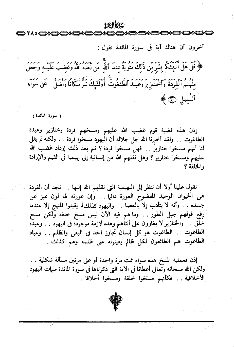 آخرون أن هناك آية في سورة المائدة تقول: {قُلْ هَلْ أُنَبِّئُكُمْ بِشَرٍّ مِّن ذلك مَثُوبَةً عِندَ الله مَن لَّعَنَهُ الله وَغَضِبَ عَلَيْهِ وَجَعَلَ مِنْهُمُ القردة والخنازير وَعَبَدَ الطاغوت أولئك شَرٌّ مَّكَاناً وَأَضَلُّ عَن سَوَآءِ السبيل} [المائدة: 60]