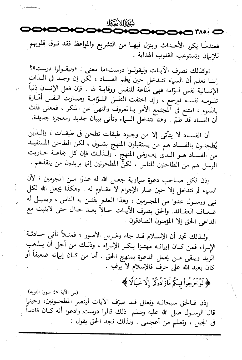 {وكذلك نُصَرِّفُ الآيات وَلِيَقُولُواْ دَرَسْتَ} ما معنى: {وَلِيَقُولُواْ دَرَسْتَ} ؟ إننا نعلم أن السماء تتدخل حين يطم الفساد، لكن إن وجد في الذات الإنسانية نفس لوّامة فهي مَنَاعة للنفس ووقاية لها. فإن فعل الإنسان ذنباً تلومه نفسه فيرجع، وإن اختفت النفس اللوّامة وصارت النفس أمّارة بالسوء، امتنع في المجتمع الأمر بالمعروف والنهي عن المنكر، فمعنى ذلك أن الفساد قد طمّ. وهنا تتدخل السماء وتأتي ببيان جديد ومعجزة جديدة.