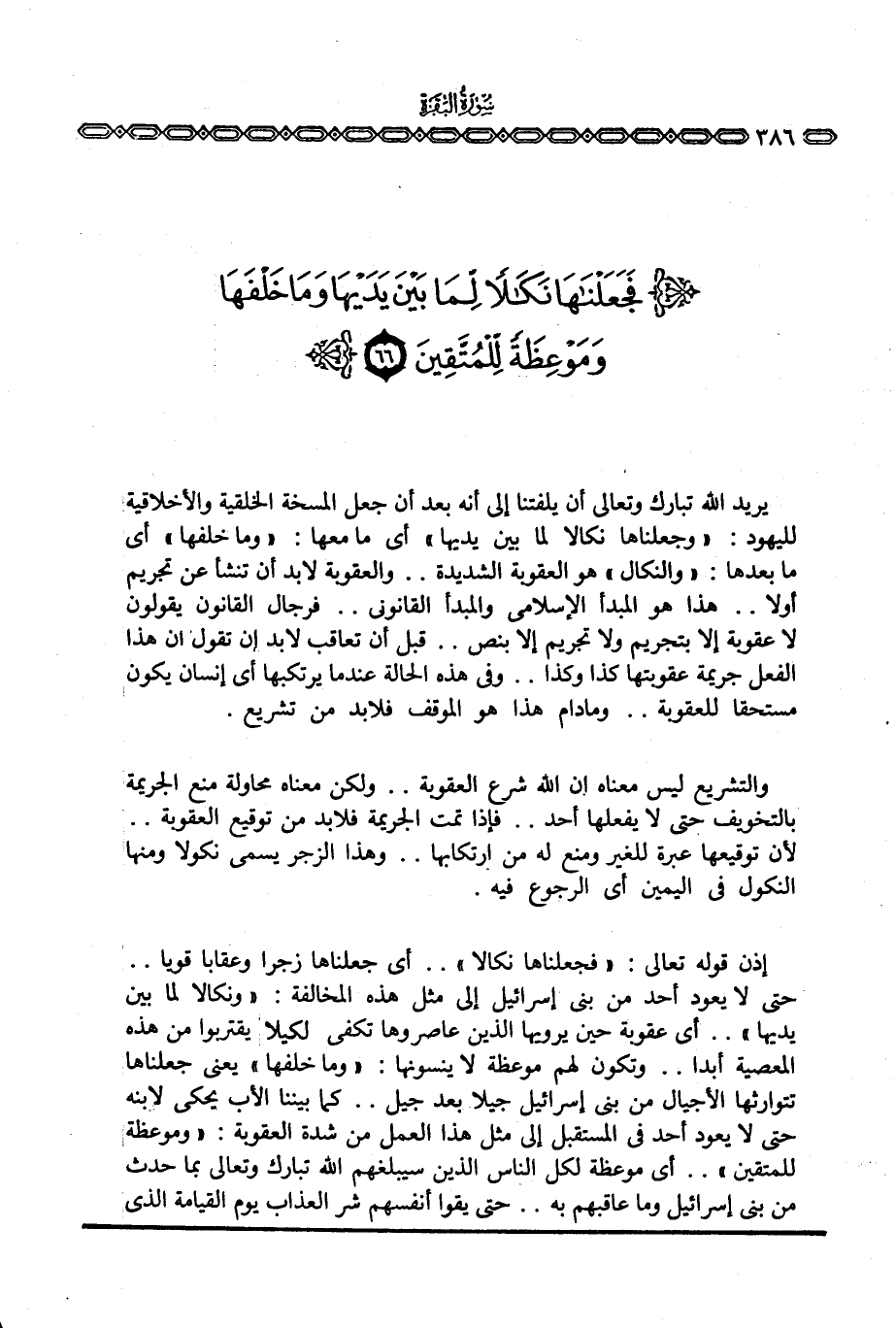 يريد الله تبارك وتعالى أن يلفتنا إلى أنه بعد أن جعل المسخة الخلقية والأخلاقية لليهود: {فَجَعَلْنَاهَا نَكَالاً لِّمَا بَيْنَ يَدَيْهَا} أي ما معها: {وَمَا خَلْفَهَا} أي ما بعدها: «والنكال» هو العقوبة الشديدة. . والعقوبة لابد أن تنشأ عن تجريم أولا. . هذا هو المبدأ الإسلامي والمبدأ القانوني. . فرجال القانون يقولون لا عقوبة إلا بتجريم ولا تجريم إلا بنص. . قبل أن تعاقب لابد أن تقول أن هذا الفعل جريمة عقوبتها كذا وكذا. . وفي هذه الحالة عندما يرتكبها أي إنسان يكون مستحقا للعقوبة. . ومادام هذا هو الموقف فلابد من تشريع.