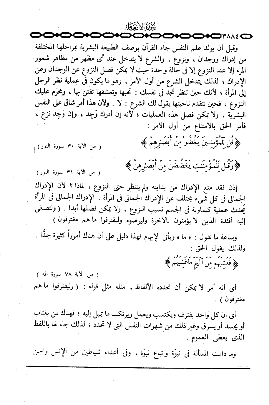 إذن فقد منع الإدراك من بدايته ولم ينتظر حتى النزوع، لماذا؟ لأن الإدراك الجمالي في كل شيء يختلف عن الإدراك الجمالي في المرأة. الإدراك الجمالي في المرأة يُحدث عملية كيماوية في الجسم تسبب النزوع، ولا يمكن فصلها أبداً. {ولتصغى إِلَيْهِ أَفْئِدَةُ الذين لاَ يُؤْمِنُونَ بالآخرة وَلِيَرْضَوْهُ وَلِيَقْتَرِفُواْ مَا هُم مُّقْتَرِفُونَ} .