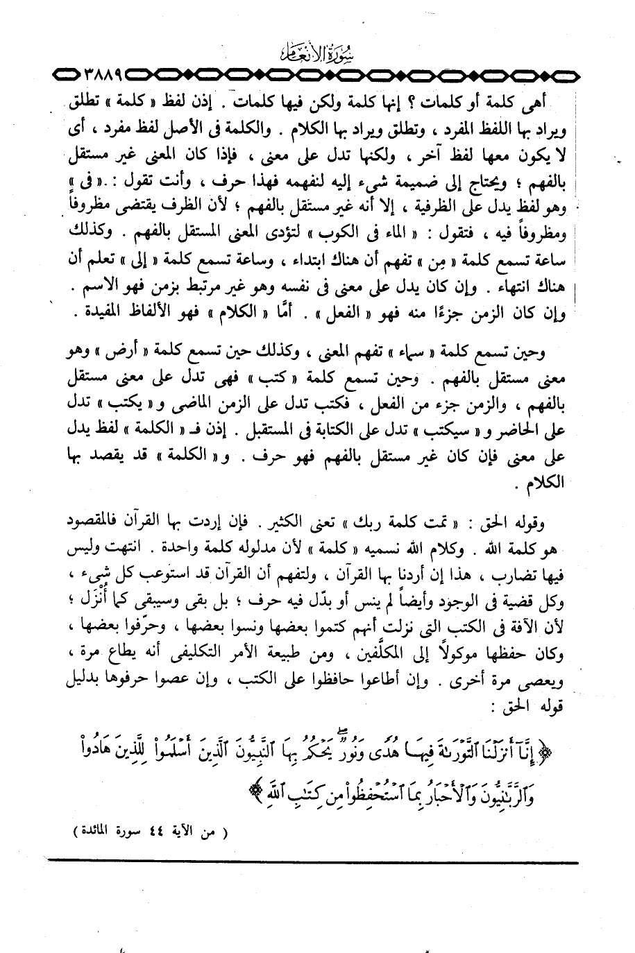 أهي كلمة أو كلمات؟ أنها كلمة ولكن فيها كلمات. إذن لفظ «كلمة» تطلق ويراد بها اللفظ المفرد، وتطلق ويراد بها الكلام. والكلمة في الأصل لفظ مفرد، أي لا يكون معها لفظ آخر، ولكنها تدل على معنى، فإذا كان المعنى غير مستقل بالفهم؛ ويحتاج إلى ضميمة شيء إليه لنفهمه فهذا حرف، وأنت تقول: «في» وهو لفظ يدل على الظرفية، إلا أنه غير مستقل بالفهم؛ لأن الظرف يقتضي مظروفاً ومظروفاً فيه، فتقول: «الماء في الكوب» لتؤدي المعنى المستقل بالفهم. وكذلك ساعة تسمع كلمة «من» تفهم أن هناك ابتداء، وساعة تسمع كلمة «إلى» تعلم أن هناك انتهاء. وإن كان يدل على معنى في نفسه وهو غير مرتبط بزمن فهو الاسم. وإن كان الزمن جزءاً منه فهو «الفعل» . أما «الكلام» فهو الألفاظ المفيدة.