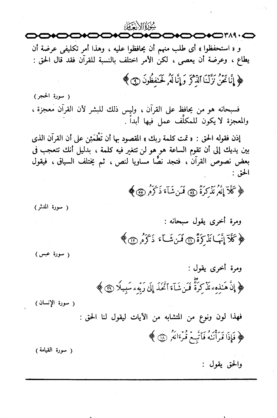 إذن فقوله الحق: {وتَمَّتْ كَلِمَتُ رَبِّكَ} المقصود بها أن تَطْمَئِن على أن القرآن الذي بين يديك إلى أن تقوم الساعة هو هو لن تتغير فيه كلمة، بدليل أنك تتعجب في بعض نصوص القرآن، فتجد نصًا مساويا لنص، ثم يختلف السياق، فيقول الحق: {كَلاَّ إِنَّهُ تَذْكِرَةٌ فَمَن شَآءَ ذَكَرَهُ} [المدثر: 54 - 55]