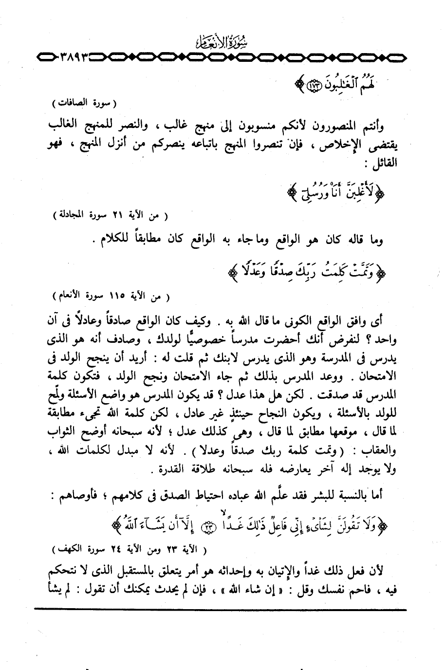أي وافق الواقع الكوني ما قال الله به وكيف كان الواقع صادقاً وعادلاً في آن واحد؟ لنفرض أنك أحضرت مدرساً خصوصيًّا لولدك، وصادف أنه هو الذي يدرس في المدرسة وهو الذي يدرس لابنك ثم قلت له: أريد أن ينجح الولد في الامتحان. ووعد المدرس بذلك ثم جاء الامتحان ونجح الولد، فتكون كلمة المدرس قد صدقت. لكن هل هذا عدل؟ قد يكون المدرس هو واضع الأسئلة ولّمح للولد بالأسئلة، ويكون النجاح حينئذٍ غير عادل، لكن كلمة الله تجيء مطابقة لما قال، موقعها مطابق لما قال، وهي كذلك عدل؛ لأنه سبحانه أوضح الثواب والعقاب: {وَتَمَّتْ كَلِمَتُ رَبِّكَ صِدْقاً وَعَدْلاً} . لأنه لا مبدل لكلمات الله، ولا يوجد إله آخر يعارضه فله سبحانه طلاقة القدرة.