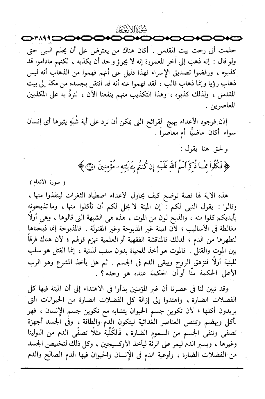 هذه الآية لها قصة توضح كيف يحاول الأعداء اصطياد الثغرات لينفذوا منها، وقالوا: يقول النبي لكم: إن الميتة لا يحل أن تأكلوا منها، وما تذبحونه بأيديكم كلوا منه، والذبح لون من الموت، هذه هي الشبهة التي قالوها، وهي أولاً مغالطة في الأساليب؛ لأن الميتة غير المذبوحة وغير المقتولة. فالمذبوحة إنما ذبحناها لنطهرها من الدم؛ لذلك فالمناقشة الفقهية أو العلمية تهزم قولهم؛ لأن هناك فرقاً بين الموت والقتل. فالموت هو أخذ للحياة بدون سلب للبنية، إنما القتل هو سلب للبنية أولاً فتزهق الروح ويبقى الدم في الجسم. ثم هل يأخذ المشرع وهو الرب الأعلى الحكمة منّا أو أن الحكمة عنده هو وحده؟ .