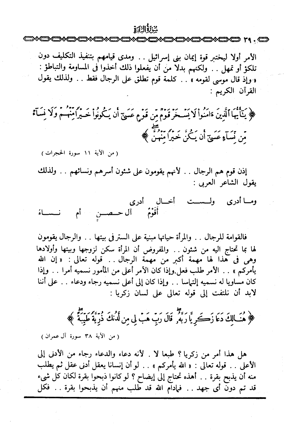 فالقوامة للرجال. . والمرأة حياتها مبنية على الستر في بيتها. . والرجال يقومون لها بما تحتاج إليه من شئون. . والمفروض أن المرأة سكن لزوجها وبيتها وأولادها وهي في هذا لها مهمة أكبر من مهمة الرجال. . قوله تعالى: {إِنَّ الله يَأْمُرُكُمْ} . . الأمر طلب فعل. وإذا كان الآمر أعلى من المأمور نسميه أمرا. . وإذا كان مساويا له نسميه إلتماسا. . وإذا كان إلى أعلى نسميه رجاء ودعاء. . على أننا لابد أن نلتفت إلى قوله تعالى على لسان زكريا: {هُنَالِكَ دَعَا زَكَرِيَّا رَبَّهُ قَالَ رَبِّ هَبْ لِي مِن لَّدُنْكَ ذُرِّيَّةً طَيِّبَةً} [آل عمران: 38]