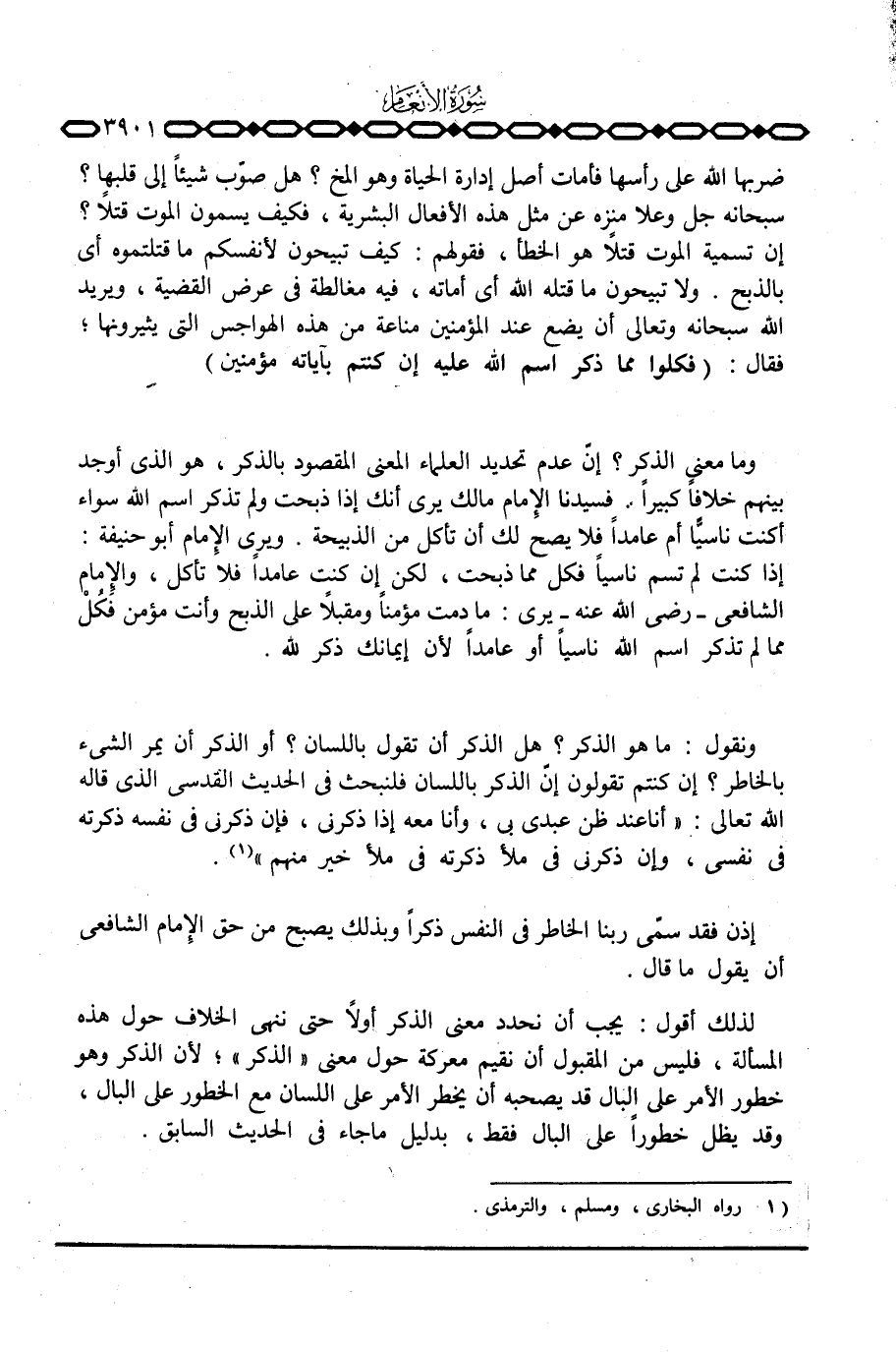 وما معنى الذكر؟ إنّ عدم تحديد العلماء المعنى المقصود بالذكر، هو الذي أوجد بينهم خلافاً كبيراً. فسيدنا الإمام مالك يرى أنك إذا ذبحت ولم تذكر اسم الله سواء أكنت ناسياً أم عامداً فلا يصح لك ان تأكل من الذبيحة. ويرى الإمام أبو حنيفة: إذا كنت لم تسم ناسياً فكل مما ذبحت، لكن إن كنت عامداً فلا تأكل، والإمام الشافعي - رَضِيَ اللَّهُ عَنْه - يرى: ما دمت مؤمناً ومقبلاً على الذبح وأنت مؤمن فَكُلْ مما لم تذكر اسم الله ناسياً أو عامداً لأن إيمانك ذكر لله.