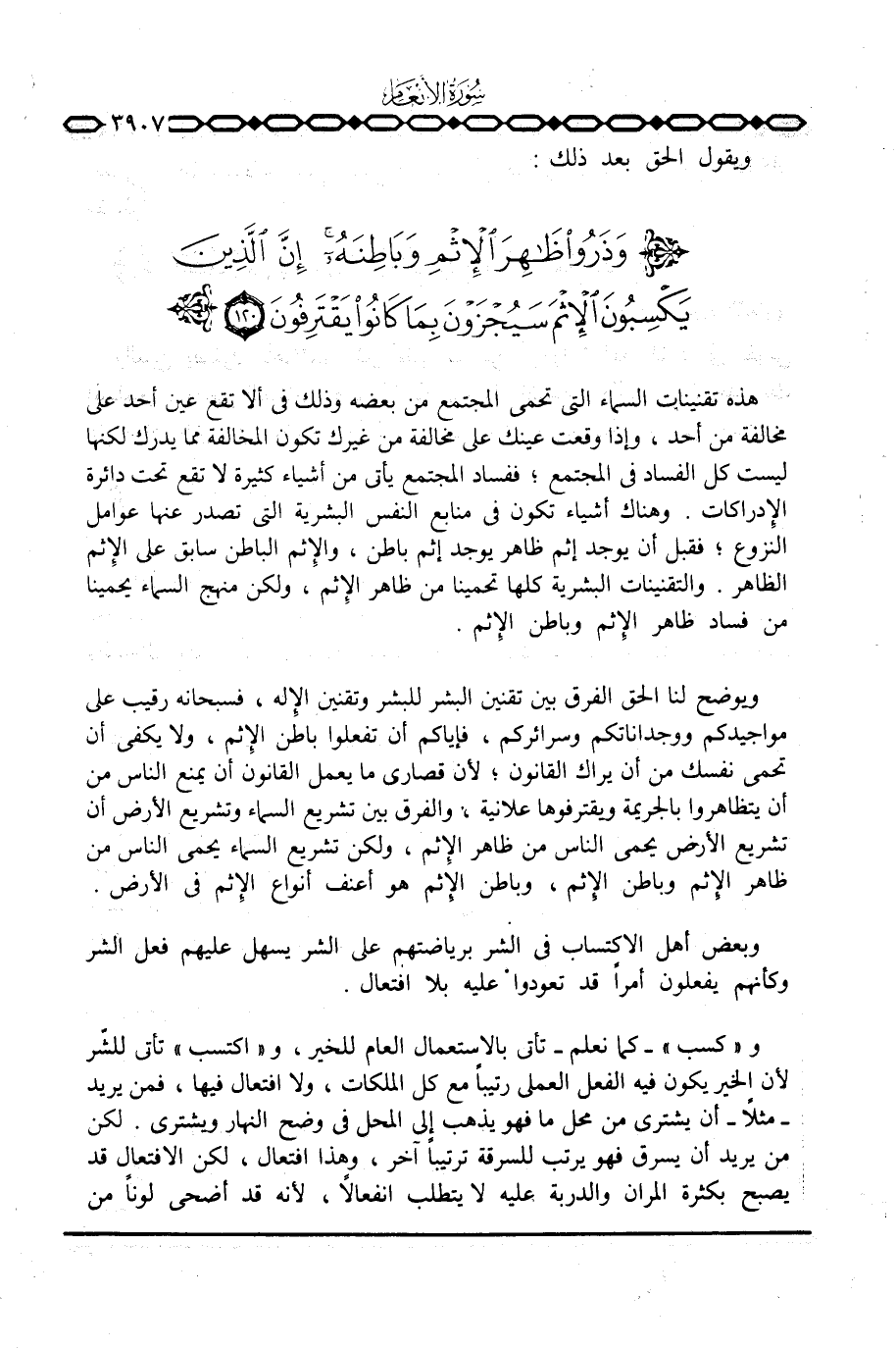 ويوضح لنا الحق الفرق بين تقنين البشر للبشر وتقنين الإِله، فسبحانه رقيب على مواجيدكم ووجداناتكم وسرائركم، فإياكم أن تفعلوا باطن الإِثم، ولا يكفي أن تحمي نفسك من أن يراك القانون؛ لأن قصارى ما يعمل القانون أن يمنع الناس من أن يتظاهروا بالجريمة ويقترفوها علانية، والفرق بين تشريع السماء وتشريع الأرض أن تشريع الأرض يحمي الناس من ظاهر الإِثم، ولكن تشريع السماء يحمي الناس من ظاهر الإِثم وباطن الإِثم، وباطن الإِثم هو أعنف أنواع الإِثم في الأرض.
