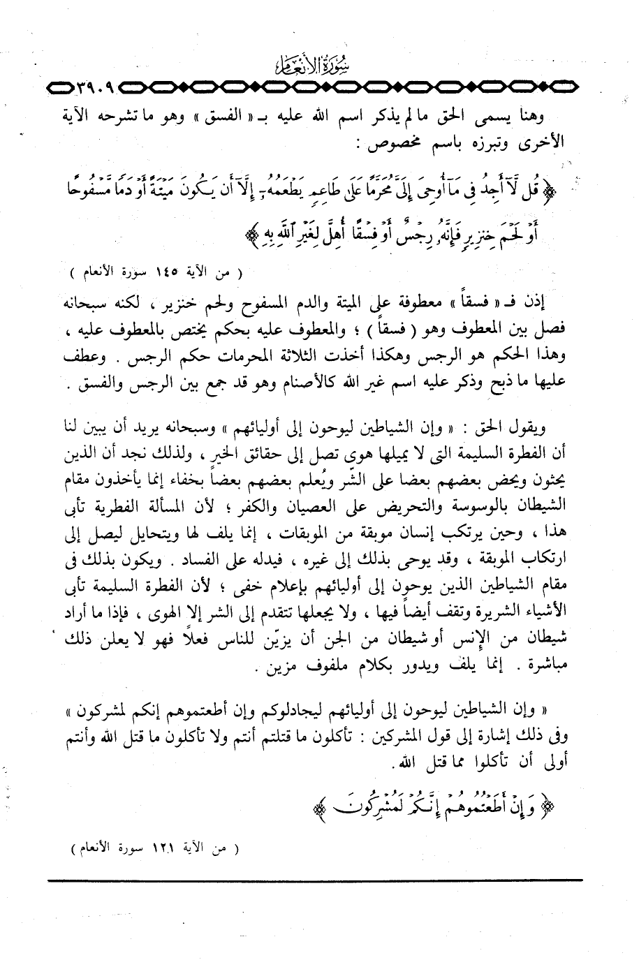 {وَإِنَّ الشياطين لَيُوحُونَ إلى أَوْلِيَآئِهِمْ لِيُجَادِلُوكُمْ وَإِنْ أَطَعْتُمُوهُمْ إِنَّكُمْ لَمُشْرِكُونَ} وفي ذلك إشارة إلى قول المشركين: تأكلون ما قتلتم أنتم ولا تأكلون ما قتل الله وأنتم أولى أن تأكلوا مما قتل الله.