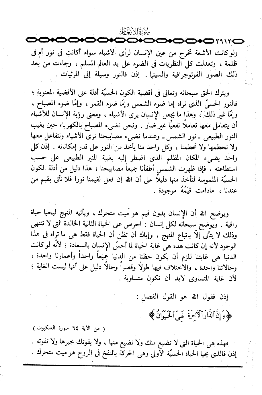 ويوضح الله أن الإنسان بدون قيم هو ميت متحرك، ويأتيه المنهج ليحيا حياة راقية. ويوضح سبحانه لكل إنسان: احرص على الحياة الثانية الخالدة التي لا تنتهي وذلك لا يتأتى الا اتباع المنهج، وإياك أن تظن أن الحياة فقط هي ما تراه في هذا الوجود لأنه إن كانت هذه هي غاية الحياة لما أحس الإنسان بالسعادة؛ لأنه لو كانت الدنيا هي غايتنا للزم أن يكون حظنا من الدنيا جميعاً واحداً وأعمارنا واحدة، وحالاتنا واحدة، والاختلاف فيها طولاً وقصراً وحالاً دليل على أنها ليست الغاية؛ لأن غاية المتساوي لا بد أن تكون متساوية.