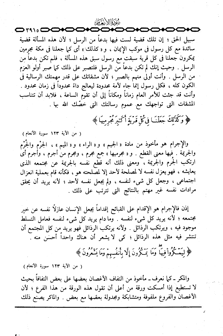 سبيل الحق؛ إن تلك قضية لست فيها بدعاً من الرسل؛ لأن هذه المسألة قضية سائدة مع كل رسول في موكب الإيمان، و «كذلك» أي كما جعلنا في مكة مجرمين يمكرون جعلنا في كل قرية سبقت مع رسول سبق هذه المسألة، فلم تكن بدعاً من الرسل. وحيث إنك لم تكن بدعاً من الرسل فلتصبر على ذلك كما صبر أولو العزم من الرسل. وأنت أولى منهم بالصبر؛ لأن مشقاتك على قدر مهمتك الرسالية في الكون كله، فكل رسول إنما جاء لأمة محدودة ليعالج داءً محدوداً في زمان محدود. وأنت قد جئت للأمر العام زماناً ومكاناً إلى أن تقوم الساعة، فلابد أن تتناسب المشقات التي تواجهك مع عموم رسالتك التي خصك الله بها. {وكذلك جَعَلْنَا فِي كُلِّ قَرْيَةٍ أَكَابِرَ مُجَرِمِيهَا} [الأنعام: 123]