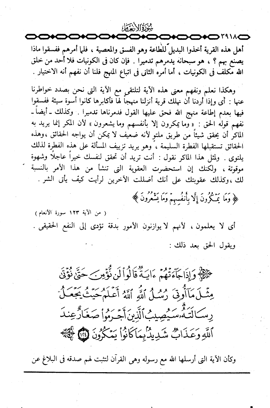 وهكذا نعلم ونفهم معنى هذه الآية لتلتقي مع الآية التي نحن بصدد خواطرنا عنها: أي وإذا أردنا أن نهلك قرية أنزلنا منهجاً فأكابرها كانوا أسوة سيئة ففسقوا فيها بعدم إطاعة منهج الله فحق عليها القول فدمرناها تدميرا. وكذلك - أيضاً - نفهم قوله الحق: {وَمَا يَمْكُرُونَ إِلاَّ بِأَنْفُسِهِمْ وَمَا يَشْعُرُونَ} لأن المكر إنما يريد به الماكر أن يحقق شيئاً من طريق ملتوٍ لأنه ضعيف لا يمكن أن يواجه الحقائق، وهذه الحقائق تستقبلها الفطرة السليمة، وهو يريد تزييف المسألة على هذه الفطرة لذلك يلتوي. ولمثل هذا الماكر نقول: أنت تريد أن تحقق لنفسك خيراً عاجلاً وشهوة موقوتة، ولكنك إن استحضرت العقوبة التي تنشأ من هذا الأمر بالنسبة لك. وكذلك عقوبتك على أنك أضللت الآخرين لرأيت كيف يأتي الشر. {وَمَا يَمْكُرُونَ إِلاَّ بِأَنْفُسِهِمْ وَمَا يَشْعُرُونَ} [الأنعام: 123]