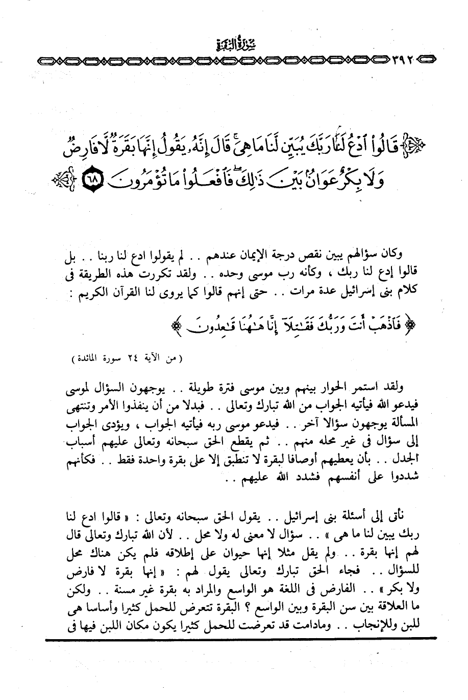 نأتي إلى أسئلة بني إسرائيل. . يقول الحق سبحانه وتعالى: {قَالُواْ ادع لَنَا رَبَّكَ يُبَيِّن لَّنَا مَا هِيَ} . . سؤال لا معنى له ولا محل. . لأن الله تبارك وتعالى قال لهم إنها بقرة. . ولم يقل مثلا إنها حيوان على إطلاقه فلم يكن هناك محل للسؤال. . فجاء الحق تبارك وتعالى يقول لهم: {إِنَّهَا بَقَرَةٌ لاَّ فَارِضٌ وَلاَ بِكْرٌ} . . الفارض في اللغة هو الواسع والمراد به بقرة غير مسنة. . ولكن ما العلاقة بين سن البقرة وبين الواسع؟ البقرة تتعرض للحمل كثيرا وأساسا هي للبن وللإنجاب. . ومادامت قد تعرضت للحمل كثيرا يكون مكان اللبن فيها في