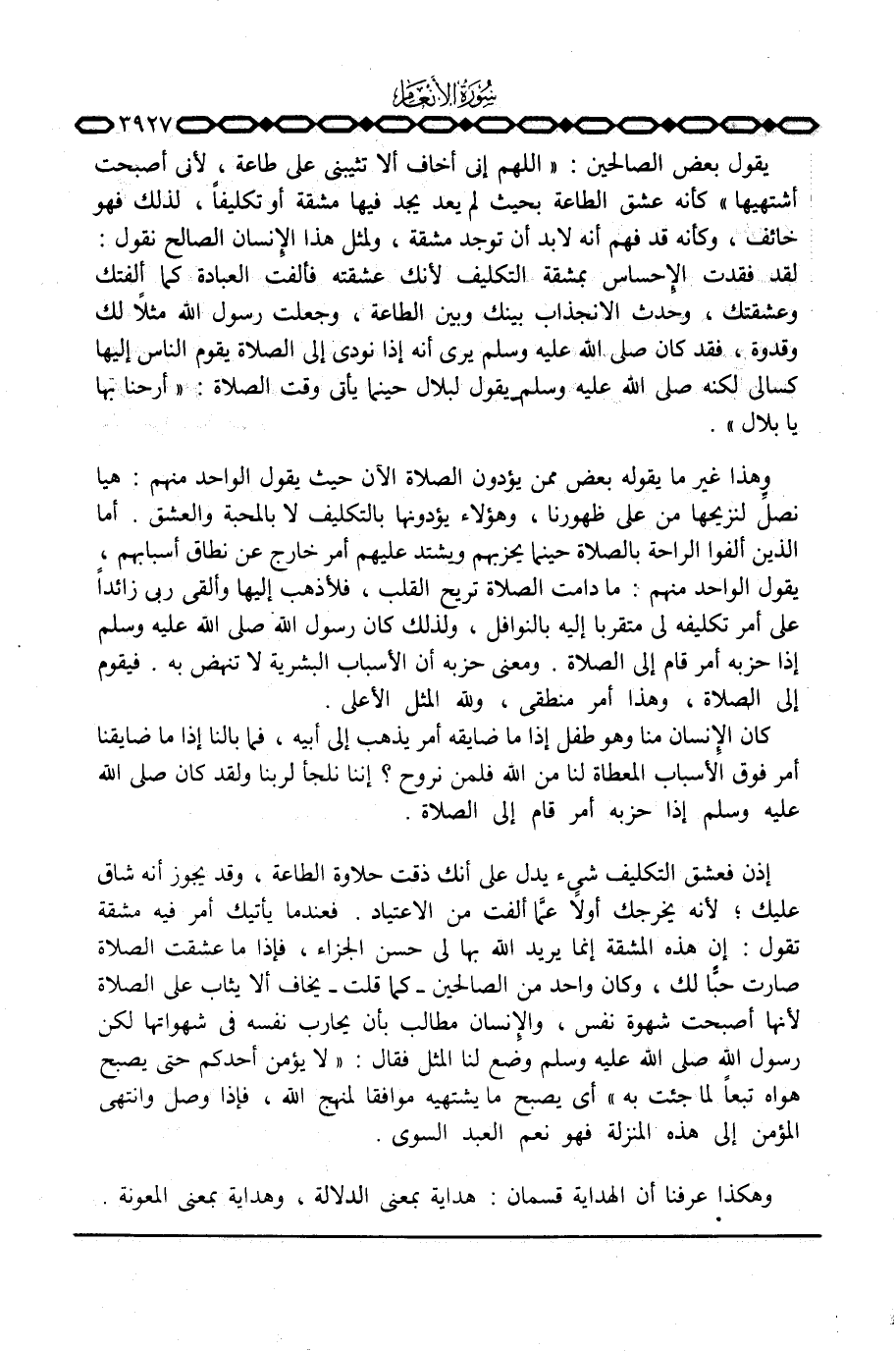 وهذا غير ما يقوله بعض ممن يؤدون الصلاة الآن حيث يقول الواحد منهم: هيا نصل لنزيحها من على ظهورنا، وهؤلاء يؤدونها بالتكليف لا بالمحبة والعشق. أما الذين ألفوا الراحة بالصلاة حينما يحزبهم ويشتد عليهم أمر خارج عن نطاق أسبابهم، ويقول الواحد منهم: مادامت الصلاة تريح القلب، فلأذهب إليها وألقى ربي زائداً على أمر تكليفه لى متقربا إليه بالنوافل، ولذلك كان رسول الله صَلَّى اللَّهُ عَلَيْهِ وَسَلَّم َ إذا حزبه أمر قام إلى الصلاة. ومعنى حزبه أن الأسباب البشرية لا تنهض به. فيقوم إلى الصلاة، وهذا أمر منطقي، لله المثل الأعلى.