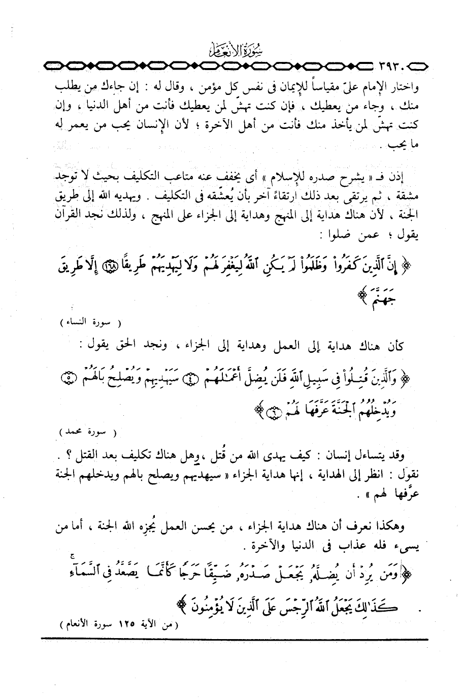 إذن ف «يشرح صدره للإسلام» أي يخفف عنه متاعب التكليف بحيث لا توجد مشقة، ثم يرتقي بعد ذلك ارتقاءًَ آخر بأن يعشقه في التكليف. ويهديه الله إلى طريق الجنة، لأن هناك هداية إلى المنهج وهداية إلى الجزاء على المنهج، ولذلك نجد القرآن يقول؛ عمن ضلوا: {إِنَّ الذين كَفَرُواْ وَظَلَمُواْ لَمْ يَكُنِ الله لِيَغْفِرَ لَهُمْ وَلاَ لِيَهْدِيَهُمْ طَرِيقاً إِلاَّ طَرِيقَ جَهَنَّمَ خَالِدِينَ فِيهَآ أَبَداً وَكَانَ ذلك عَلَى الله يَسِيراً} [النساء: 168 - 169]