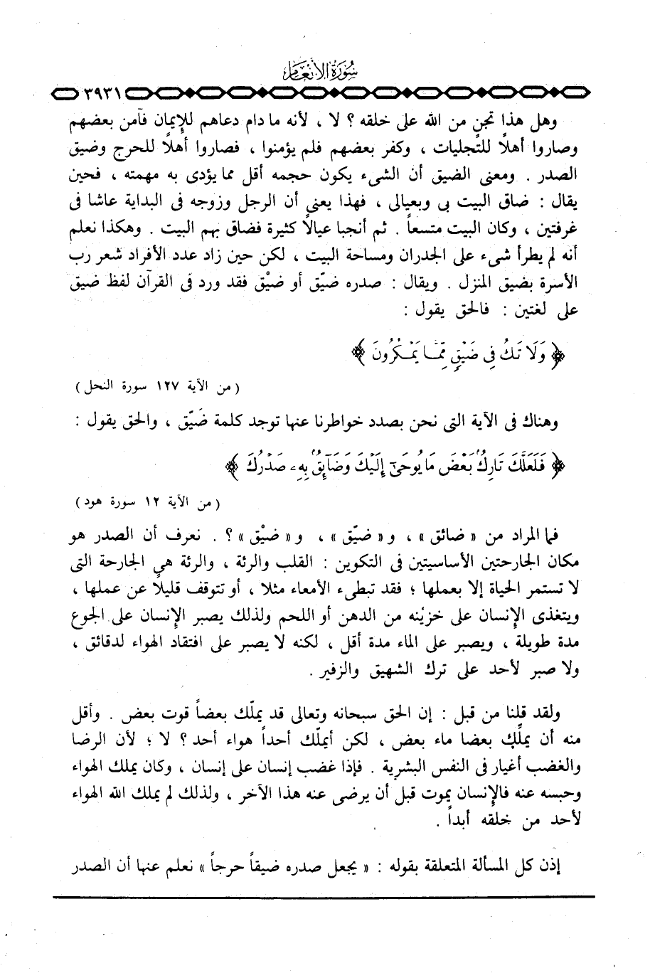 فما المراد من «ضائق» ، و «ضيَق» ، و «ضيْق» ؟ . نعرف أن الصدر هو مكان الجارحتين الأساسيتين في التكوين: القلب والرئة، والرئة هي الجارحة التي لا تستمر الحياة الا بعملها؛ فقد تبطئ الأمعاء مثلا، أو تتوقف قليلا عن عملها، ويتغذى الإنسان على خزينته من الدهن أو اللحم ولذلك يصبر الإنسان على الجوع مدة طويلة، ويصبر على الماء مدة أقل، لكنه لا يصبر على افتقاد الهواء لدقائق، ولا صبر لأحد على ترك الشهيق والزفير.