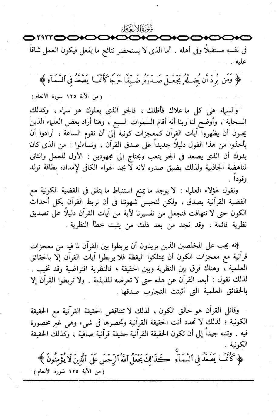 وقائل القرآن هو خالق الكون، لذلك لا تتناقض الحقيقة القرآنية مع الحقيقة الكونية؛ لذلك لا تحدد أنت الحقيقة القرآنية وتحصرها في شيء وهي غير محصورة فيه. وتنبه جيداً إلى أن تكون الحقيقة القرآنية حقيقة قرآنية صافية، وكذلك الحقيقة الكونية. {. . كَأَنَّمَا يَصَّعَّدُ فِي السمآء كذلك يَجْعَلُ الله الرجس عَلَى الذين لاَ يُؤْمِنُونَ} [الأنعام: 125]