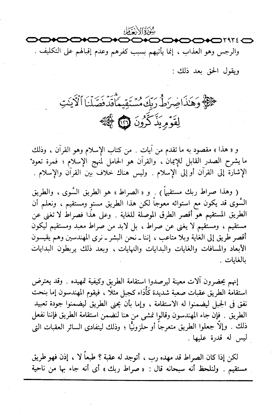 {وهذا صِرَاطُ رَبِّكَ مُسْتَقِيماً} . و «الصراط» هو الطريق السَّوي، والطريق السَّوي قد يكون مع استوائه معوجاً لكن هذا الطريق مستوٍ ومستقيم، ونعلم أن الطريق المستقيم هو أقصر الطرق الموصلة للغاية. وعلى هذا فصراط لا تغني عن مستقيم، ومستقيم لا يغني عن صراط، بل لابد من صراط معبد ومستقيم ليكون أقصر طريق إلى الغاية وبلا متاعب، إننا - نحن البشر - نرى المهندسين وهم يقيسون الأبعاد والمسافات والغايات والبدايات والنهايات، وبعد ذلك يربطون البدايات بالغايات.