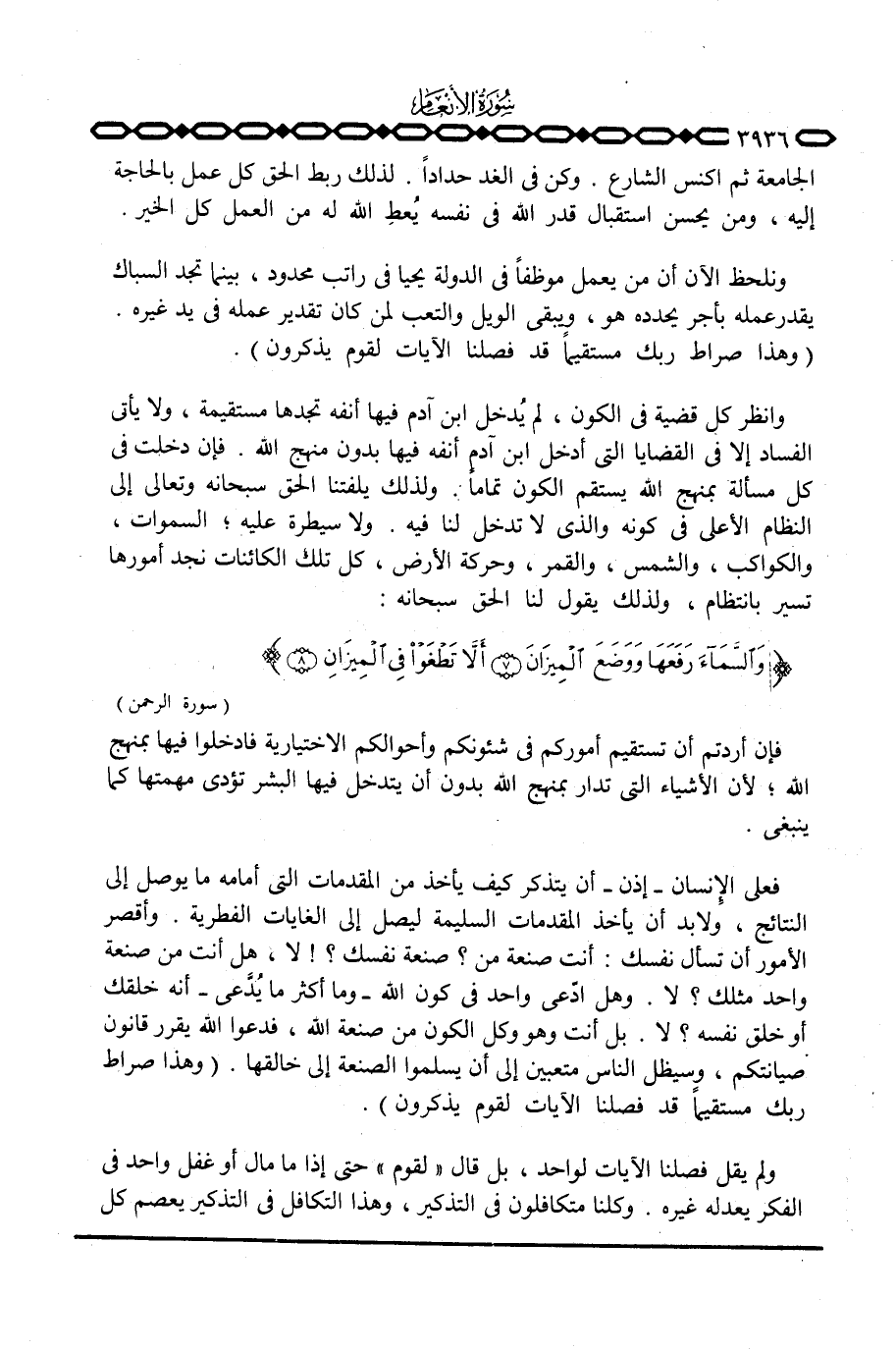 فعلى الإِنسان - إذن - أن يتذكر كيف يأخذ من المقدمات التي أمامه ما يوصل إلى النتائج، ولابد أن يأخذ المقدمات السليمة ليصل إلى الغايات الفطرية. وأقصر الأمور أن تسأل نفسك: أنت صنعة من؟ صنعة نفسك؟ لا، هل أنت من صنعة واحد مثلك؟ لا. وهل ادّعى واحد في كون الله - وما أكثر ما يُدَّعى - أنه خلقك أو خلق نفسه؟ لا. بل أنت وهو وكل الكون من صنعة الله، فدعوا الله يقرر قانون صيانتكم، وسيظل الناس متعبين إلى أن يسلموا الصنعة إلى خالقها. {وهذا صِرَاطُ رَبِّكَ مُسْتَقِيماً قَدْ فَصَّلْنَا الآيات لِقَوْمٍ يَذَّكَّرُونَ} .