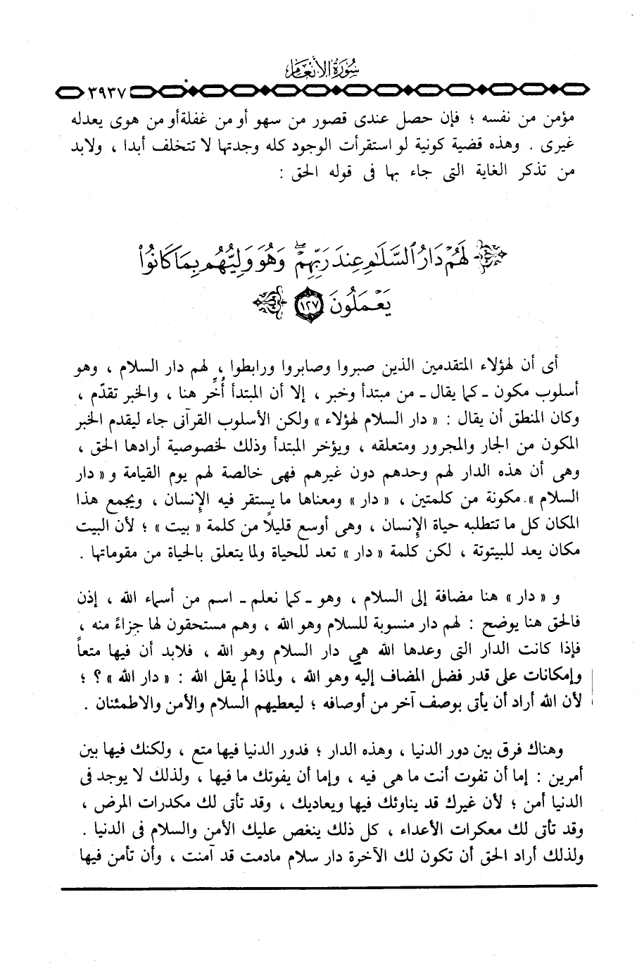 أي أن لهؤلاء المتقدمين الذين صبروا وصابروا ورابطوا، لهم دار السلام، وهو أسلوب مكون - كما يقال - من مبتدأ وخبر، الا أن المبتدأ أُخرِّ هنا، والخبر تقدّم، وكان المنطق أن يقال: «دار السلام لهؤلاء» ولكن الأسلوب القرآني جاء ليقدم الخبر المكون من الجار والمجرور ومتعلقه، ويؤخر المبتدأ وذلك لخصوصية أرادها الحق، وهي أن هذه الدار لهم وحدهم دون غيرهم فهي خالصة لهم يوم القيامة و «دار السلام» مكونة من كلمتين، «دار» ومعناها ما يستقر فيه الإنسان، ويجمع هذا المكان كل ما تتطلبه حياة الإنسان، وهي أوسع قليلاً من كلمة «بيت» ؛ لأن البيت مكان يعد للبيتوتة، لكن كلمة «دار» تعد للحياة ولما يتعلق بالحياة من مقوماتها.