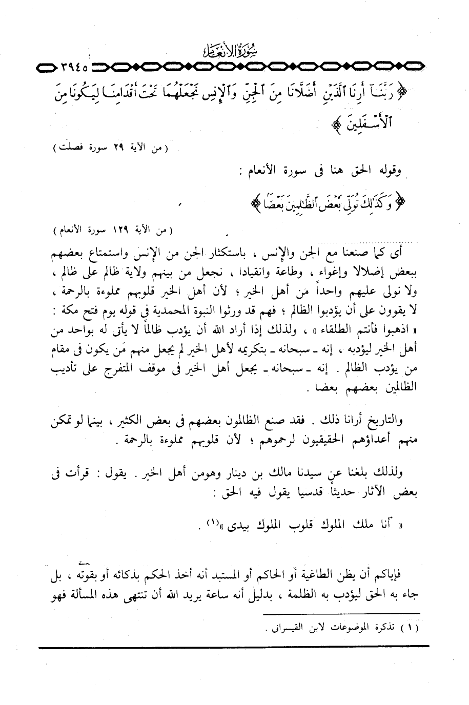 ولذلك بلغنا عن سيدنا مالك بن دينار وهو من أهل الخير. يقول: قرأت في بعض الآثار حديثاً قدسيا يقول فيه الحق:» أنا ملك الملوك قلوب الملوك بيدي. «
