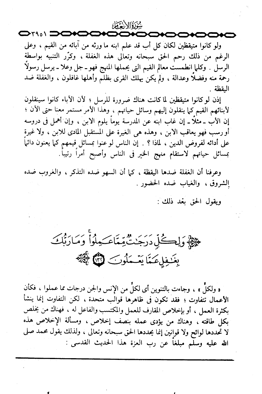 {وَلِكُلٍّ} ، وجاءت بالتنوين أي لكلٍّ من الإِنس والجن درجات مما عملوا، فكأن الأعمال تتفاوت؛ فقد تكون في ظاهرها قوالب متحدة، لكن التفاوت إنما ينشأ بكثرة العمل، أو بإخلاص المقارف للعمل والمكتسب والفاعل له، فهناك من يخلص بكل طاقته، وهناك من يؤدي عمله بنصف إخلاص، ومسألة الإِخلاص هذه لا تحددها لوائح ولا قوانين إنما يحددها الحق سبحانه وتعالى، ولذلك يقول محمد صَلَّى اللَّهُ عَلَيْهِ وَسَلَّم َ مبلغاً عن رب العزة هذا الحديث القدسي: «