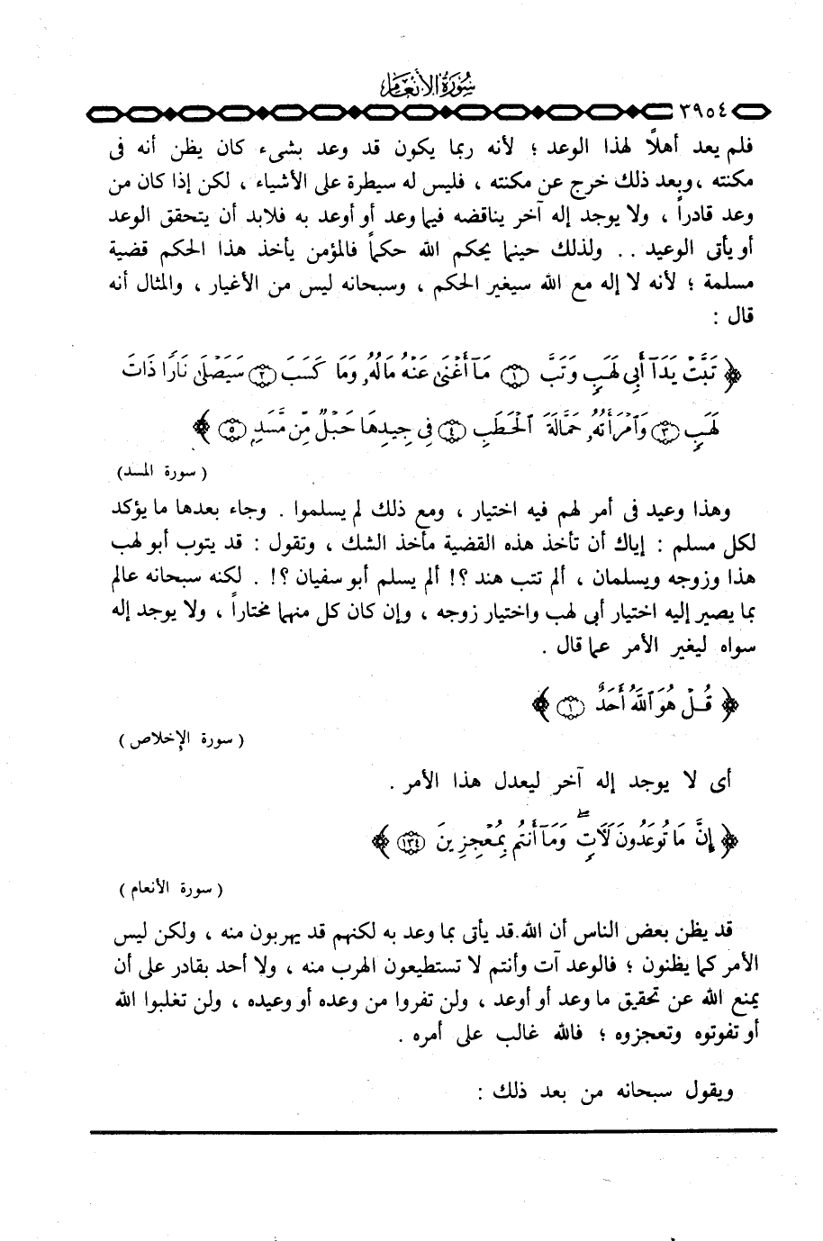 فلم يعد أهلاً لهذا الوعد؛ لأنه ربما يكون قد وعد بشيء كان يظن أنه في مكنته، وبعد ذلك خرج عن مكنته، فليس له سيطرة على الأشياء، لكن إذا كان من وعد قادراً، ولا يوجد إله آخر يناقضه فيما وعد أو أوعد به فلابد أن يتحقق الوعد أو يأتي الوعيد. . ولذلك حينما يحكم الله حكماً فالمؤمن يأخذ هذا الحكم قضية مسلمة؛ لأنه لا إله مع الله سيغير الحكم، وسبحانه ليس من الأغيار، والمثال أنه قال: {تَبَّتْ يَدَآ أَبِي لَهَبٍ وَتَبَّ مَآ أغنى عَنْهُ مَالُهُ وَمَا كَسَبَ سيصلى نَاراً ذَاتَ لَهَبٍ وامرأته حَمَّالَةَ الحطب فِي جِيدِهَا حَبْلٌ مِّن مَّسَدٍ} [المسد: 1 - 5]