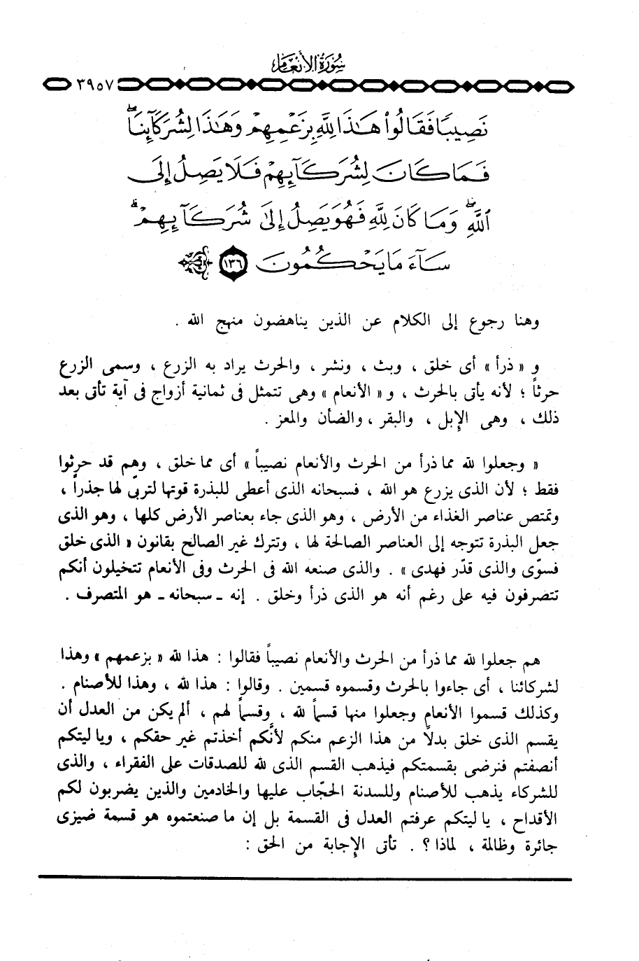 و «ذرأ» أي خلق، وبث، وبشر، والحرث يراد به الزرع، وسمى الزرع حرثاً؛ لأنه يأتي بالحرث، و «الأنعام» وهي تتمثل في ثمانية أزواج في آية تأتي بعد ذلك، وهي الأبل، والبقر، والضأن والمعز.