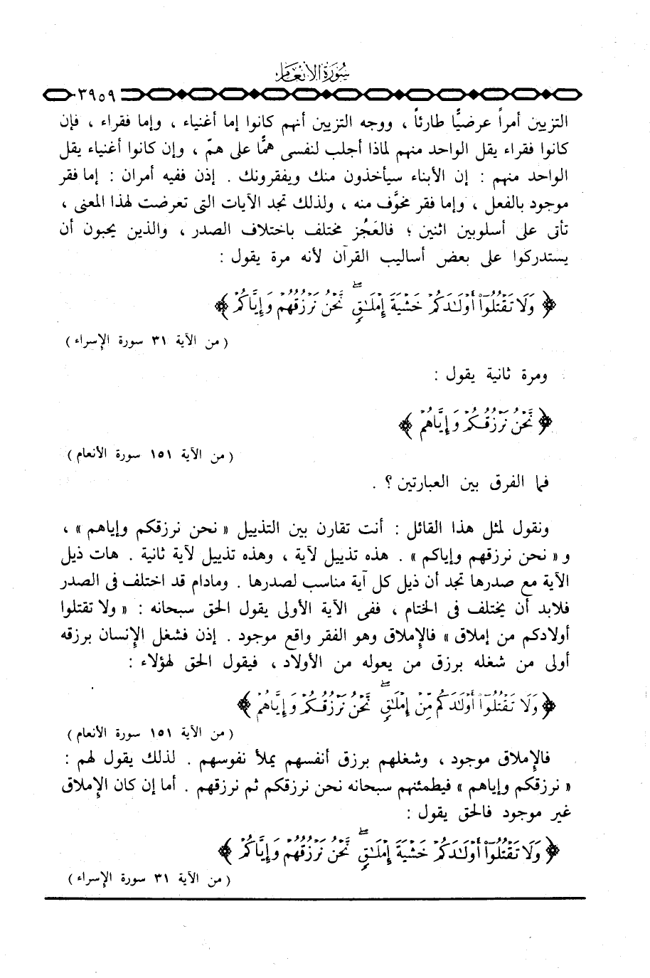 ونقول لمثل هذا القائل: أنت تقارن بين التذييل {نَّحْنُ نَرْزُقُكُمْ وَإِيَّاهُمْ} ، و {نَّحْنُ نَرْزُقُهُمْ وَإِيَّاكُم} . هذا تذييل لآية، وهذه تذييل لآية ثانية. هات ذيل الآية مع صدرها نجد أن ذيل كل آية مناسب لصدرها. ومادام قد اختلف في الصدر فلابد أن يختلف في الختام، ففي الآية الأولى يقول الحق سبحانه: {وَلاَ تقتلوا أَوْلادَكُمْ خَشْيَةَ إِمْلاقٍ} فالإملاق وهو الفقر واقع موجود. إذن فشغل الإنسان برزقه أولى من شغله برزق من يعوله من الأولاد، فيقول الحق لهؤلاء: {وَلاَ تقتلوا أَوْلاَدَكُمْ مِّنْ إمْلاَقٍ نَّحْنُ نَرْزُقُكُمْ وَإِيَّاهُمْ ... } [الأنعام: 151]