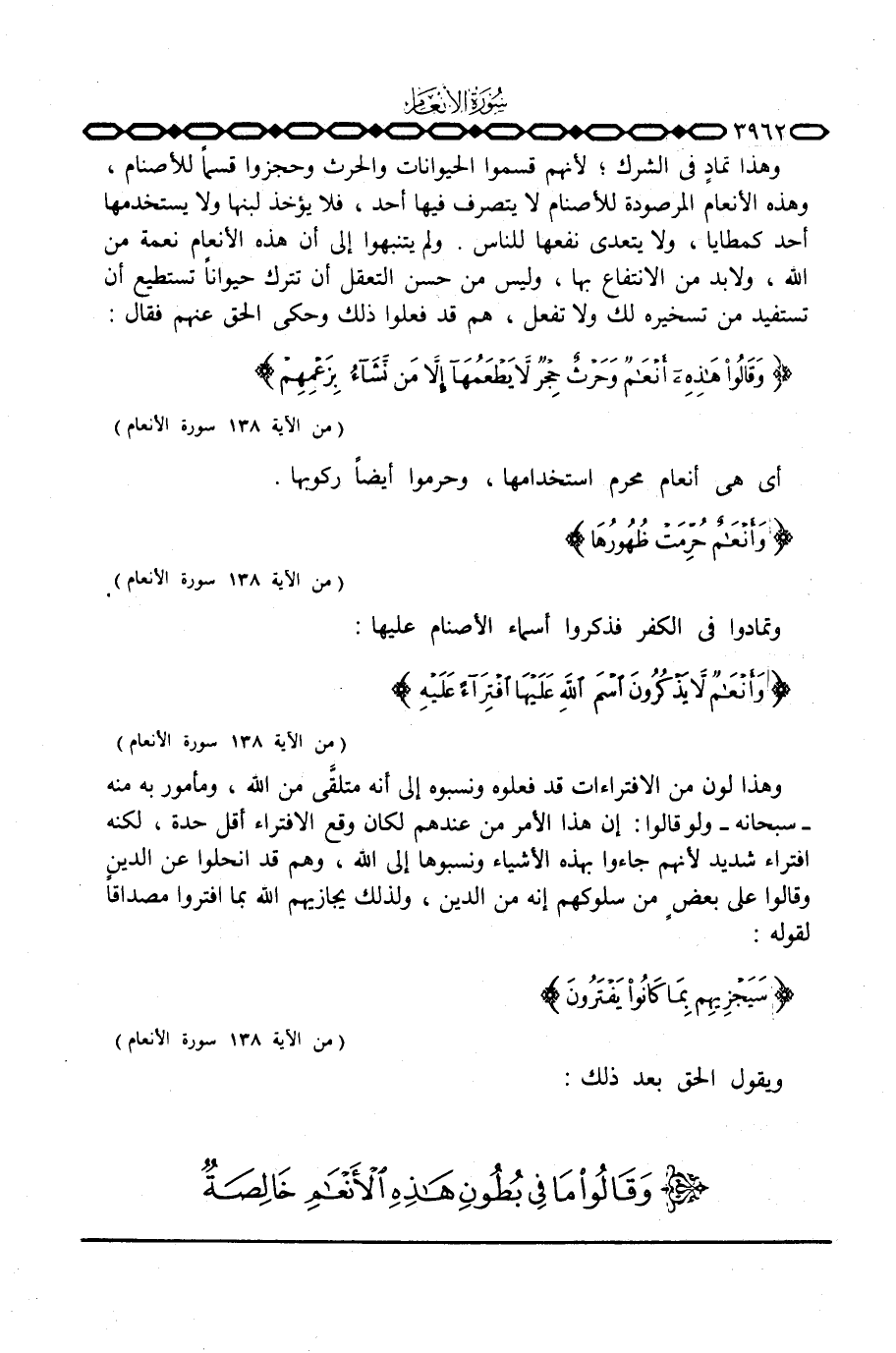 وهذا تمادٍ في الشرك؛ لأنهم قسموا الحيوانات والحرث وحجزوا قسماً للأصنام، وهذه الأنعام المرصودة للأصنام لا يتصرف فيها أحد، فلا يؤخذ لبنها ولا يستخدمها أحد كمطايا، ولا يتعدى نفعها للناس. ولم يتنبهوا إلى أن هذه الأنعام نعمة من الله، ولابد من الانتفاع بها، وليس من حسن التعقل أن تترك حيواناً تستطيع أن تستفيد من تسخيره لك ولا تفعل، هم قد فعلوا ذلك وحكى الحق عنهم فقال: {وَقَالُواْ هذه أَنْعَامٌ وَحَرْثٌ حِجْرٌ لاَّ يَطْعَمُهَآ إِلاَّ مَن نَّشَآءُ بِزَعْمِهِمْ. .} [الأنعام: 138]
