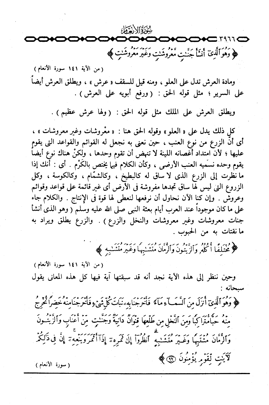 كل ذلك يدل على» العلو «وقوله الحق هنا: {مَّعْرُوشَاتٍ وَغَيْرَ مَعْرُوشَاتٍ} ، أي أن الزرع من نوع العنب، حين نعني به نجعل له القوائم والقواعد التي يقوم عليها؛ لأن امتداد أغصانه اللينة لا تنهض أن تقوم وحدها، ولكن هناك نوع أيضاً يقوم وحده نسميه العنب الأرضي، وكأن الكلام فيما يختص بالكَرْم. أي: أنك إذا ما نظرت إلى الزرع الذي لا ساق له كالبطيخ، والشمام، وكالكوسة، وكل الزروع التي ليس لها ساق تجدها مفروشة في الأرض أي غير قائمة على قواعد وقوائم وعروش. وإن كنا الآن نحاول أن نرفعها لنعطي لها قوة الإنتاج. والكلام جاء على ما كان موجوداً عند العرب أيام بعثة النبي صَلَّى اللَّهُ عَلَيْهِ وَسَلَّم َ {وَهُوَ الذي أَنشَأَ جَنَّاتٍ مَّعْرُوشَاتٍ وَغَيْرَ مَعْرُوشَاتٍ والنخل والزرع} . والزرع يطلق ويراد به ما نقتات به من الحبوب.