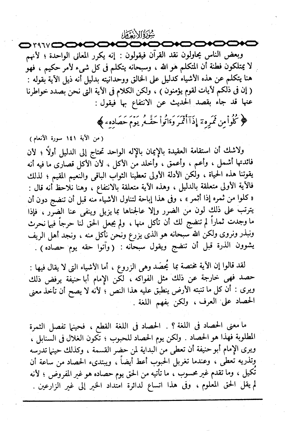 ما معنى الحصاد في اللغة؟ . الحصاد في اللغة القطع، فحينما تفصل الثمرة المطلوبة فهذا هو الحصاد. ولكن يوم الحصاد للحبوب؛ تكون الغلال في السنابل، ويرى الإِمام أبو حنيفة أن تعطي من البداية لمن حضر القسمة، وكذلك حينما تدرسه وتذريه تعطي، وعندما تغربل الحبوب أعط أيضاً، ويبتدئ الحصاد من ساعة أن تُكيل، وما تقدم غير محسوب، ما تأتيه من الحق يوم حصاده هو غير المفروض؛ لأنه لم يقل الحق المعلوم، وفي هذا اتساع لدائرة امتداد الخير إلى غير الزارعين.