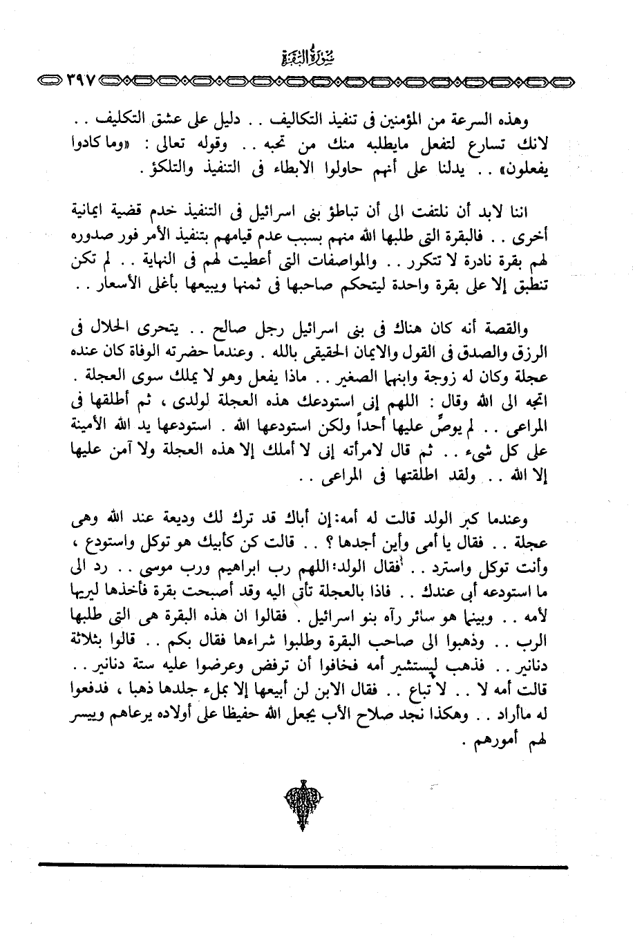إننا لابد أن نلتفت إلى أن تباطؤ بني إسرائيل في التنفيذ خدم قضية إيمانية أخرى. . فالبقرة التي طلبها الله منهم بسبب عدم قيامهم بتنفيذ الأمر فور صدوره لهم بقرة نادرة لا تتكرر. . والمواصفات التي أعطيت لهم في النهاية. . لم تكن تنطبق إلا على بقرة واحدة ليتحكم صاحبها في ثمنها ويبيعها بأغلى الأسعار. .