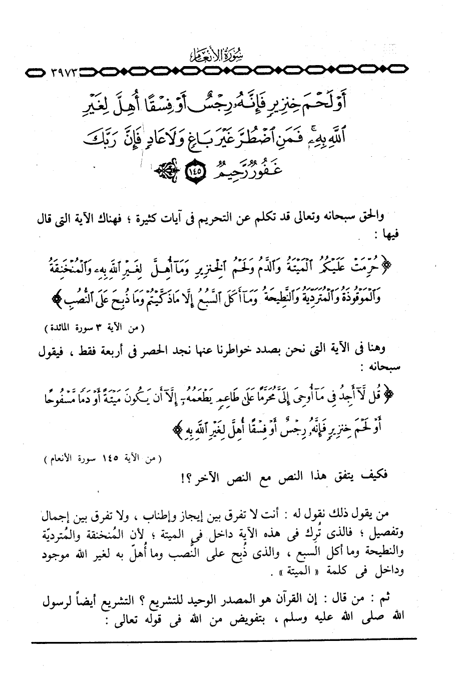 من يقول ذلك نقول له: أنت لا تفرق بين إيجاز وإطناب، ولا تفرق بين إجمال وتفصيل؛ فالذي تُرِك في هذه الآية داخل في الميتة؛ لأن المنخقة والمتردية والنطيحة وما أكل السبع، والذي ذُبح على النصب وما أهلّ به لغير الله موجود وداخل في كلمة «الميتة» .
