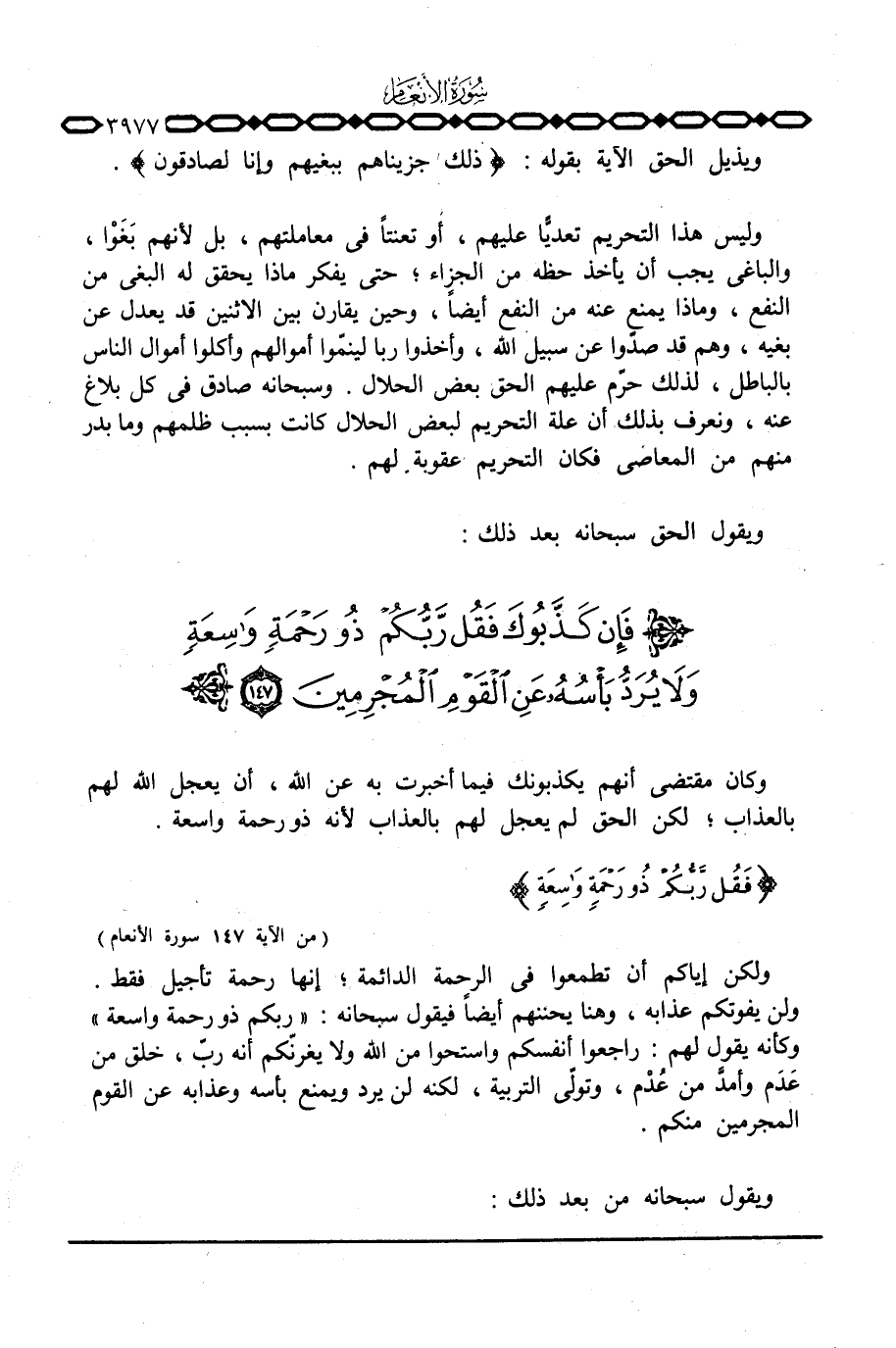 ولكن إياكم أن تطمعوا في الرحمة الدائمة؛ إنها تأجيل فقط. ولن يفوتكم عذابه، وهنا يحننهم ايضاً فيقول سبحانه: {رَّبُّكُمْ ذُو رَحْمَةٍ وَاسِعَةٍ} وكأنه يقول لهم: راجعوا أنفسكم واستحوا من الله ولا يغرنّكم انه ربّ، خلق من عَدَم وأمدَّ من عُدْم، وتولّى التربية، لكنه لن يرد ويمنع بأسه وعذابه عن القوم المجرمين منكم.