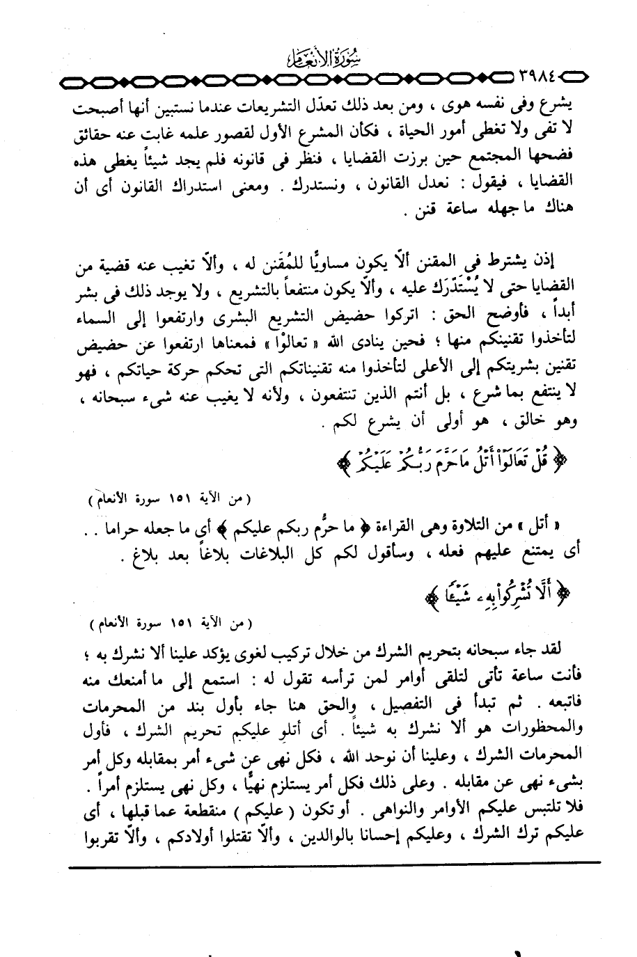إذن يشترط في المقنن ألاّ يكون مساويًّا للمُقَنن له، وألاّ تغيب عنه قضية من القضايا حتى لا يُسْتَدّرَك عليه، وألاّ يكون منتفعاً بالتشريع، ولا يوجد ذلك في بشر أبداً، فأوضح الحق: اتركوا حضيض التشريع البشري وارتفعوا إلى السماء لتأخذوا تقنينكم منها؛ فحين ينادي الله «تعالوْا» فمعناها ارتفعوا عن حضيض تقنين بشريتكم إلى الأعلى لتأخذوا منه تقنيانكم التي تحكم حركة حياتكم، فهو لا ينتفع بما شرع، بل أنتم الذين تنتفعون، ولأنه لا يغيب عنه شيء سبحانه، وهو خالق، هو أولى ان يشرع لكم. {قُلْ تَعَالَوْاْ أَتْلُ مَا حَرَّمَ رَبُّكُمْ عَلَيْكُمْ} [الأنعام: 151]
