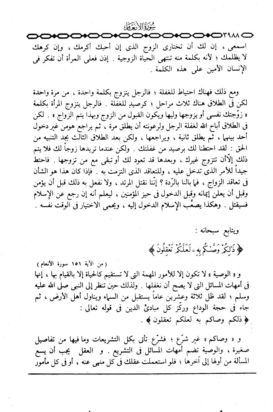 و «الوصية» لا تكون إلا للأمور المهمة التي لا تستقيم كالحياة إلا بالقيام بها، إنها في أمهات المسائل التي لا يصح أن نغفلها. ولذلك حين تنظر إلى النبي صَلَّى اللَّهُ عَلَيْهِ وَسَلَّم َ؛ لقد ظل ثلاثة وعشرين عاماً يستقبل من السماء ويناول أهل الأرض، ثم جاء في حجة الوداع وركّز كل مبادئ الدين في قوله تعالى: {ذلكم وَصَّاكُمْ بِهِ لَعَلَّكُمْ تَعْقِلُونَ} .