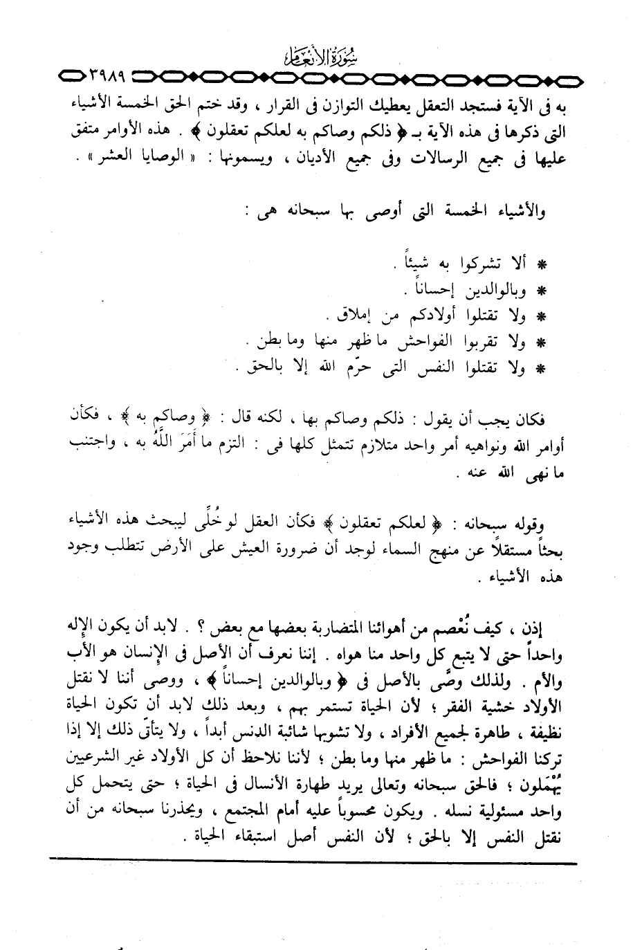 به في الآية فستجد التعقيل يعطيك التوازن في القرار، وقد ختم الحق الخمسة الأشياء التي ذكرها في هذه الآية ب {ذلكم وَصَّاكُمْ بِهِ لَعَلَّكُمْ تَعْقِلُونَ} . وهذه الأوامر متفق عليها في جميع الرسالات وفي جميع الأديان، ويسمونها: «الوصايا العشر» .