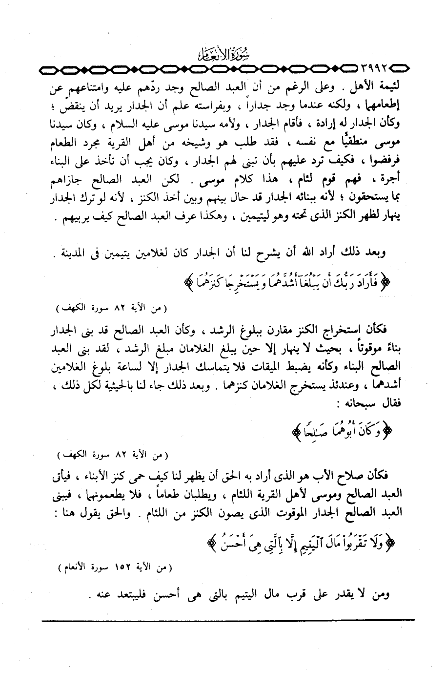 فكأن صلاح الأب هو الذي أراد به الحق أن يظهر لنا كيف حمى كنز الأبناء، فيأتي العبد الصالح وموسى لأهل القرية اللئام، ويطلبان طعاماً، فلا يطعمونهما، فيبي العبد الصالح الجدار الموقوت الذي يصون الكنز من اللئام. والحق يقول هنا: {وَلاَ تَقْرَبُواْ مَالَ اليتيم إِلاَّ بالتي هِيَ أَحْسَنُ. .} [الأنعام: 152]
