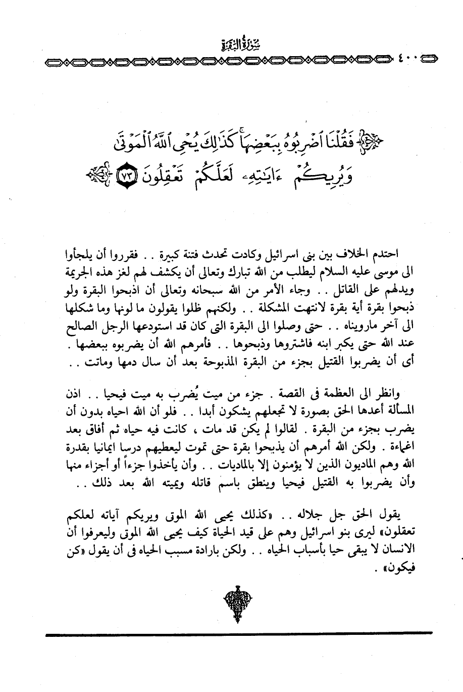 يقول الحق جل جلاله. . {كَذَلِكَ يُحْيِي الله الموتى وَيُرِيكُمْ آيَاتِهِ لَعَلَّكُمْ تَعْقِلُونَ} ليرى بنو إسرائيل وهم على قيد الحياة كيف يحيى الله الموتى وليعرفوا أن الإنسان لا يبقى حيا بأسباب الحياة. . ولكن بإرادة مسبب الحياة في أن يقول «كن فيكون» .