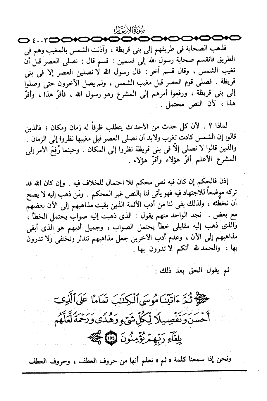 فذهب الصحابة في طريقهم إلى بني قريظة، وآذنت الشمس بالمغيب وهم في الطريق فانقسم صحابة رسول الله إلى قسمين: قسم قال: نصلي العصر قبل أن تغيب الشمس، وقال قسم آخر: قال رسول الله لا نصلين العصر إلا في بني قريظة. فصلى قوم العصر قبل مغيب الشمس، ولم يصل الآخرون حتى وصلوا إلى بني قريظة، ورفعوا أمرهم إلى المشرع وهو رسول الله، فأقرّ هذا، وأقرّ هذا، لأن النص محتمل.