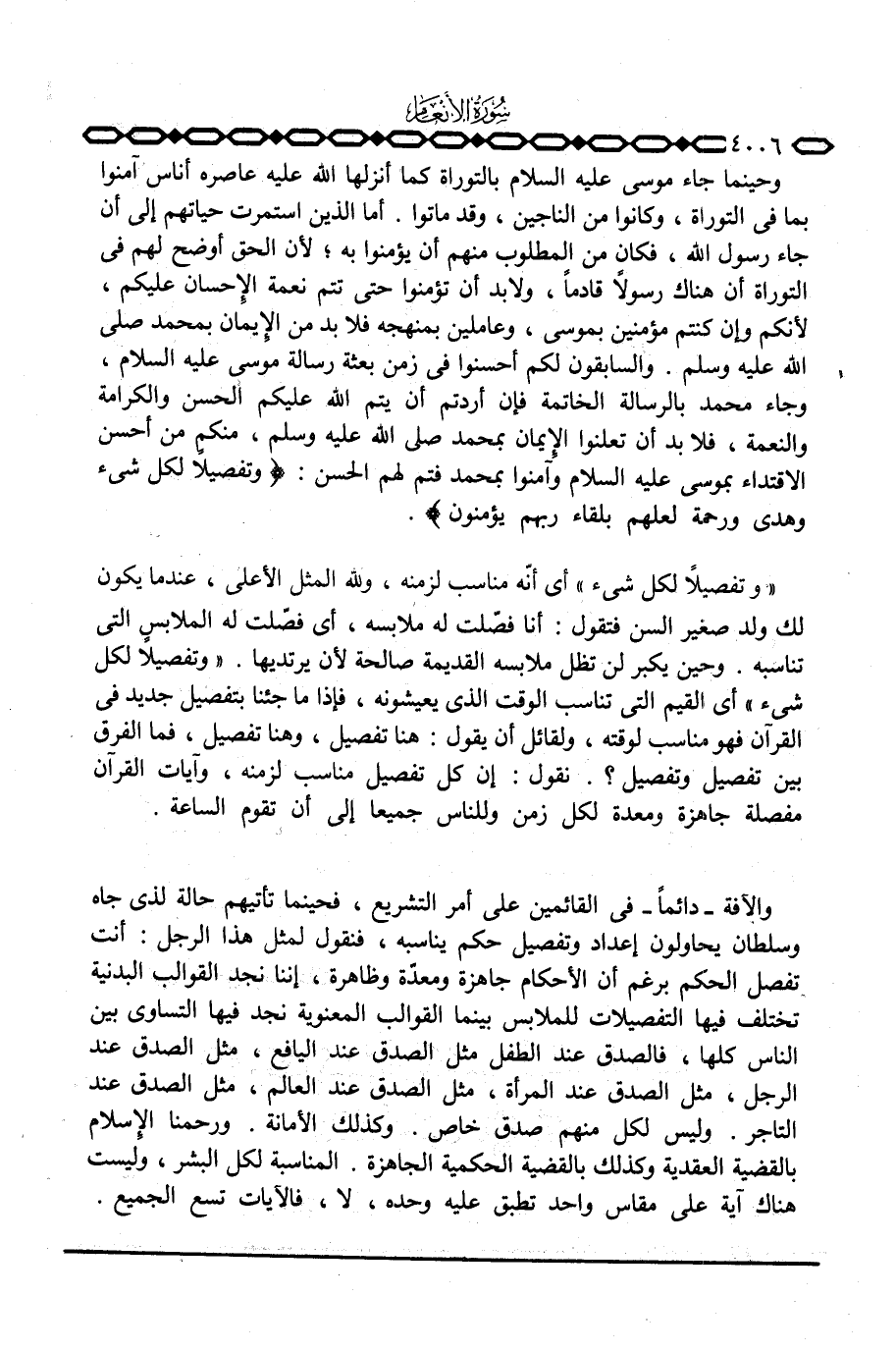 {وَتَفْصِيلاً لِّكُلِّ شَيْءٍ} أي أنّه مناسب لزمنه، ولله المثل الأعلى، عندما يكون لك ولد صغير السن فتقول: أنا فصلت له ملابسه، أي فصلت له الملابس التي تناسبه. وحين يكبر لن تظل ملابسه القديمة صالحة لأن يرتديها. {وَتَفْصِيلاً لِّكُلِّ شَيْءٍ} أي القيم التي تناسب الوقت الذي يعيشونه، فإذا ما جئنا بتفصيل جديد في القرآن فهو مناسب لوقته، ولقائل أن يقول: هنا تفصيل، وهنا تفصيل، فما الفرق بين تفصيل وتفصيل؟ . نقول: إن كل تفصيل مناسب لزمنه، وآيات القرآن مفصلة جاهزة ومعدة لكل زمن وللناس جميعا إلى أن تقوم الساعة.