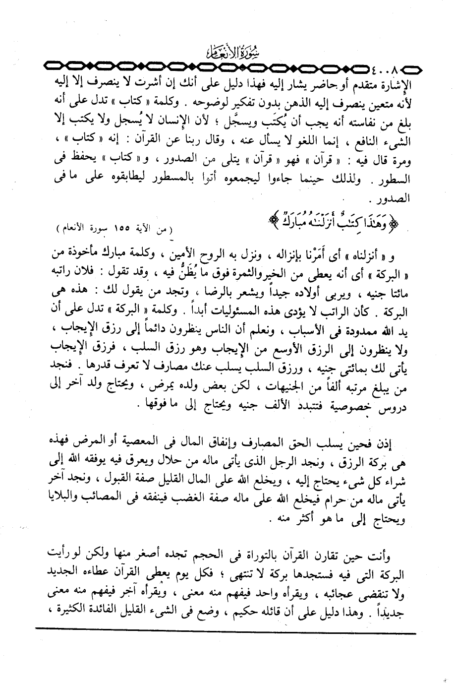الإشارة متقدم أو حاضرة يشار إليه فهذا دليل على أنك إن أشرت لا ينصرف إلا إليه لأنه متعين ينصرف إليه الذهن بدون تفكير لوضوحه. وكلمة {كِتَابٌ} تدل على أنه بلغ من نفاسته أنه يجب أن يُكتَب ويسجل؛ لأن الإنسان لا يُسجل ولا يكتب إلا الشيء النافع، إنما اللغو لا يسأل عنه، وقال ربنا عن القرآن: إنه «كتاب» ، ومرة قال فيه: «قرآن» فهو «قرآن» يتلى من الصدور، و «كتاب» يحفظ في السطور. ولذلك حينما جاءوا ليجمعوه اتوا بالمسطور ليطابقوه على ما في الصدور. {وهذا كِتَابٌ أَنزَلْنَاهُ مُبَارَكٌ ... } [الأنعام: 155]